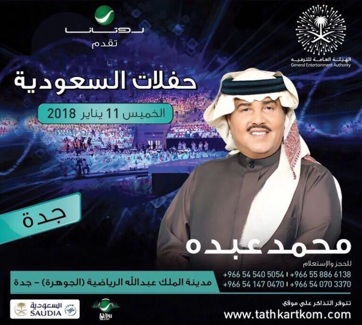 بعد غد (الخميس 11 يناير2018) يفتتح فنان العرب محمد عبده أولى الحفلات الغنائية للعام الجديد في الصالة "المغطاة" بملعب الجوهرة بمدينة الملك عبد الله الرياضية بجدة، لكن هذه الحفلة لن يشارك الفنان محمد عبده أي فنان، كما كان في حفل الافتتاح العام الفائت. وحتى الآن لم تتضح رؤية من ستكون الفرقة الموسيقية التي سترافق الفنان محمد عبده، وقد يكون قائد الفرقة هو المايسترو هاني فرحات، الذي كان قائداً للفرقة الموسيقية التي رافقت الفنانين في حفلاتهم خلال الفترة الماضية في السعودية.
