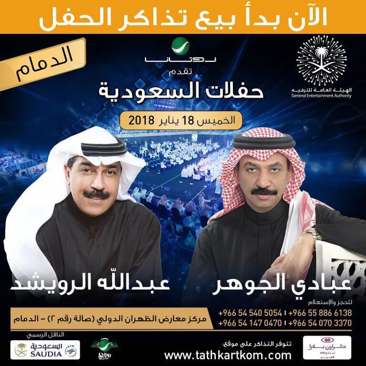 بعد عودته من دبي مطلع الأسبوع المقبل يستعد "أخطبوط العود" الفنان عبادي الجوهر لإحياء حفلتين في يومين متتالين، وهي ضمن "حفلات السعودية" التي تنظمها شركة "روتانا" بدعم من الهيئة العامة للترفيه. الحفلة الأولى سيحييها عبادي الجوهر والفنان الكويتي عبد الله الرويشد، وستكون في الدمام يوم الخميس الموافق 18 يناير، وفي اليوم التالي (الجمعة 19 يناير) يحيي الجوهر حفلته الثانية في الصالة "المغطاة" بملعب الجوهرة بمدينة الملك عبد الله الرياضية بجدة، ويشارك فيها كل من الفنانين نبيل شعيل ووليد الشامي. وهذا يعني أن الفنان عبادي الجوهر سينهي حفلته في الدمام ليعود في نفس الليلة إلى جدة ليحصل على قسط من الراحة استعداداً لحفلة جدة، وهي الحفلة التي كانت مقررة بتاريخ (23-11-2017) وتمّ تأجيلها بسبب الأمطار الغزيرة التي هطلت على مدينة جدة وحالت دون وصول الفرقة الموسيقية إلى جدة في الموعد المحدد لإجراء البروفات، لكن تم إضافة المطرب وليد الشامي إلى جانب النجمين عبادي الجوهر ونبيل شعيل.