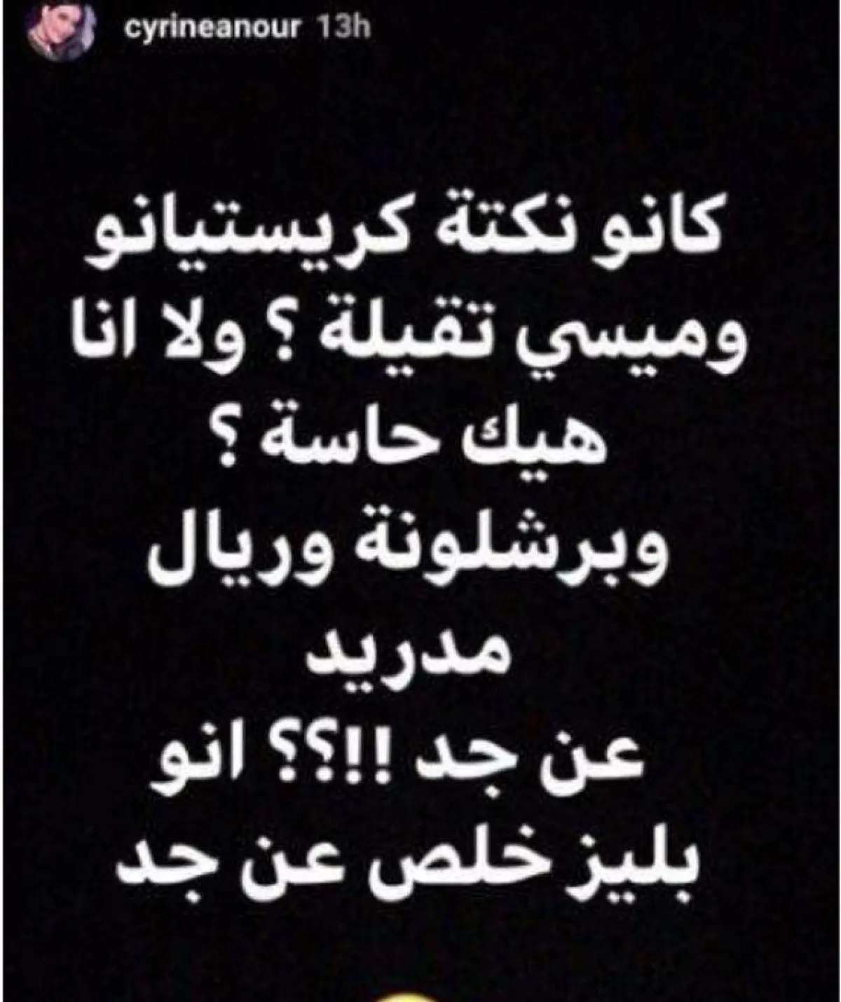 وكتبت سيرين عبد النور عبر حسابها على "إنستا ستوري": "كانت نكتة كريستيانو وميسي ثقيلة ولا أنا حاسة هيك؟ وبرشلونة وريال مدريد عن؟. بليز خلص عن جد".