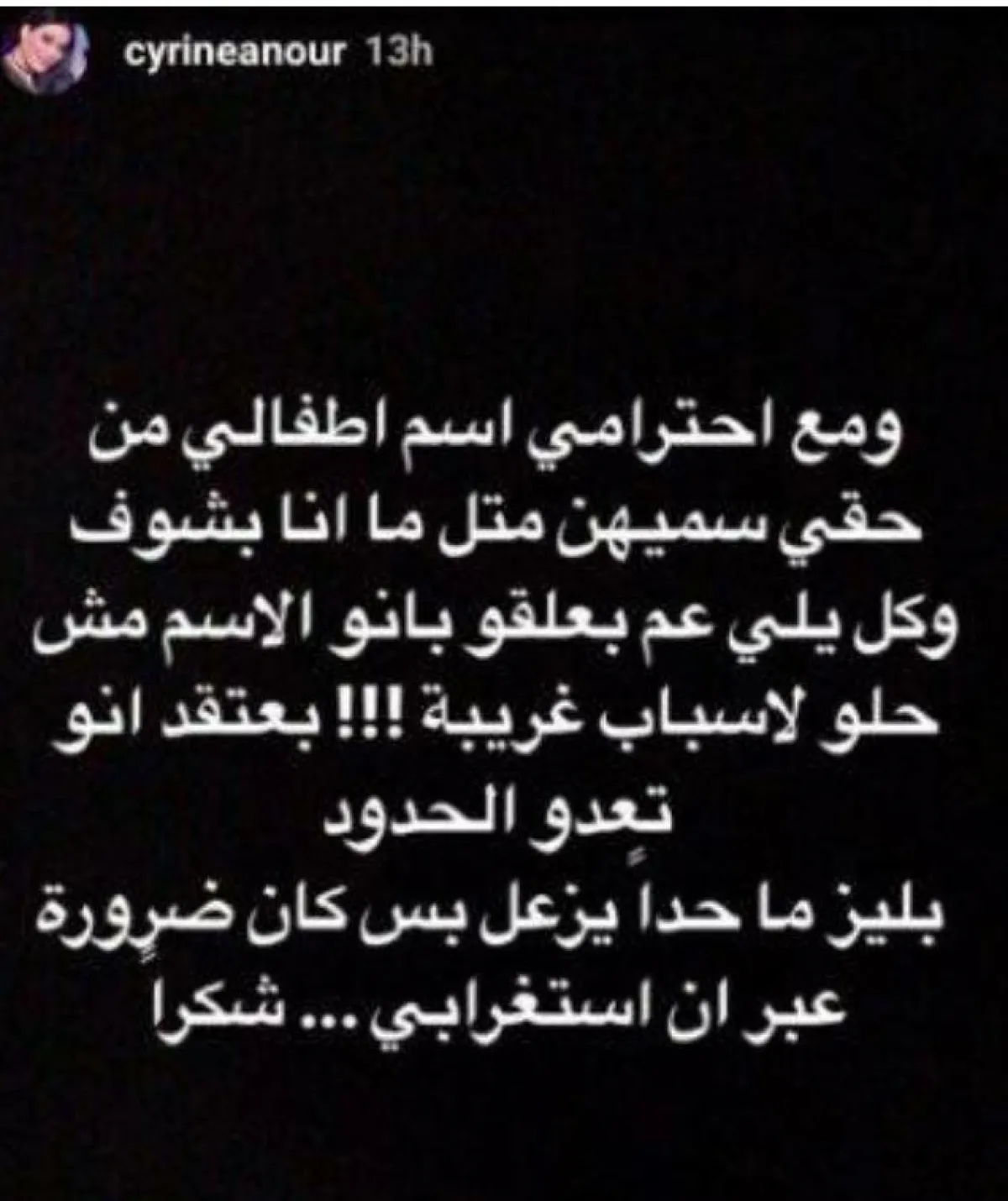 وأضافت: "مع احترامي، أطفالي من حقي أن أسمّيهم كما أريد ، وكل من يعلّق بأنّ الاسم غير جميل لأسباب غريبة، أعتقد أنه تخطى حدوده. أرجوكم ، ما حدا يزعل ولكن من الضرورة أن أعبّر عن استغرابي، شكرًا".