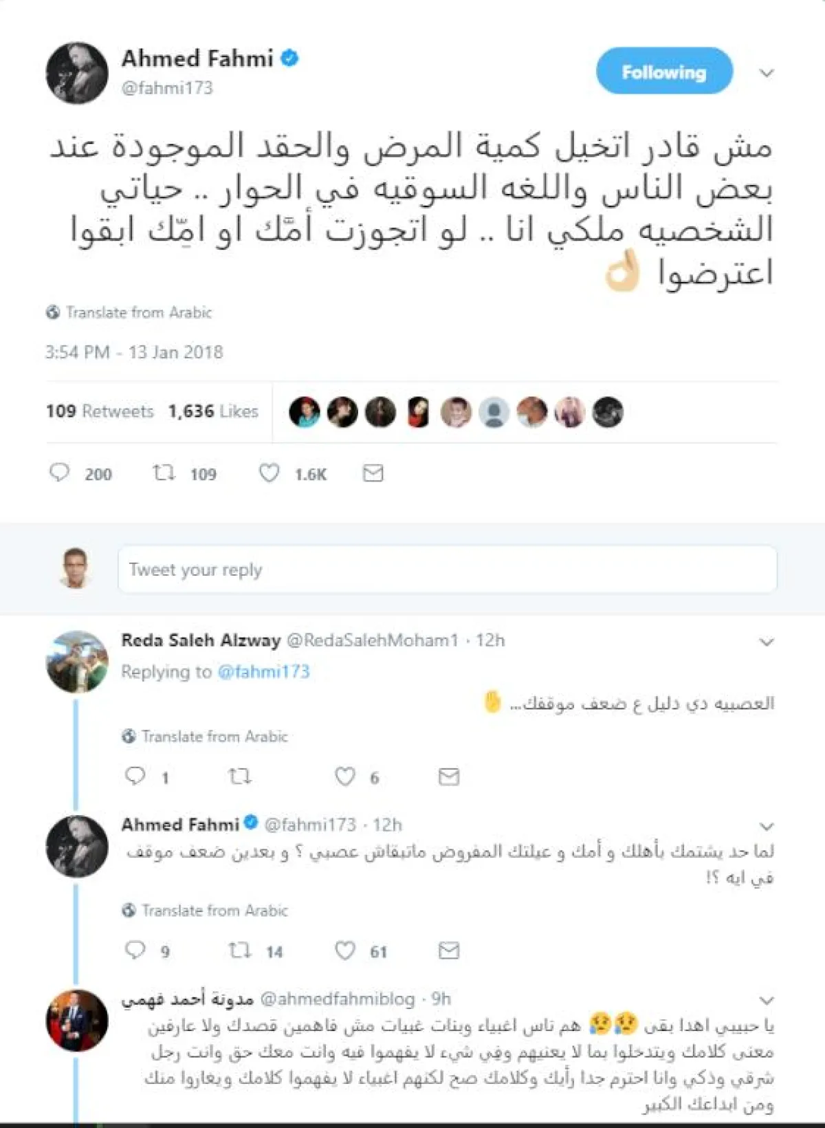 تخلى الفنان أحمد فهمي عن هدوئه المعتاد، ونشر تغريدة مسيئة جداً بحق جمهوره، تعقيباً على الجدل المثار حول تصريحاته الأخيرة برفضه اختلاط زوجته بالرجال، قائلاً لمن ينتقده: "لو اتجوزت أمَّك او اختك ابقوا اعترضوا".