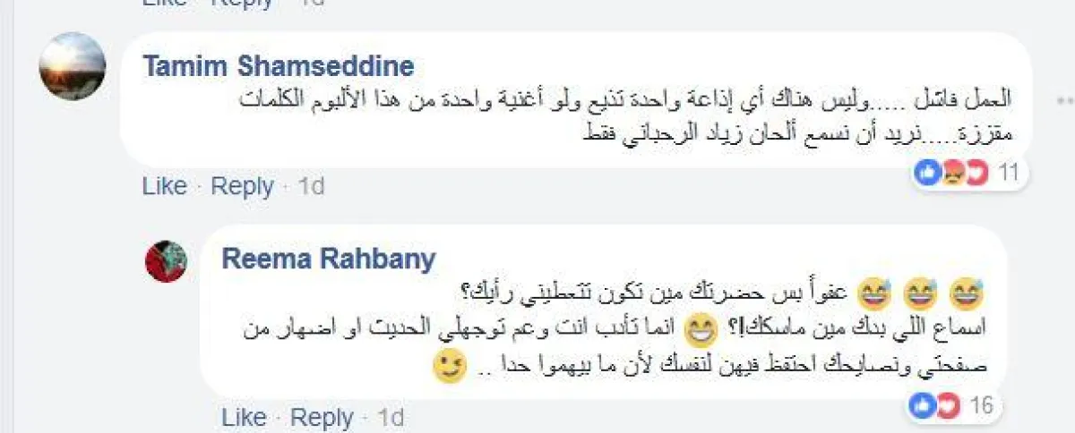 إلا أنّ الحوار خرج عن إطاره الودّي ليأخذ طابع المناكفة، لدى قيام أحد المعلّقين بوصف العمل بالفاشل، كما وصف كلمات الأغاني بالمقزّزة مطالباً بألحان من زياد الرحباني، الأمر الذي دفع ريما بالطلب إليه إما أن يعلق بتهذيب وإما أن يخرج من صفحتها، قبل أن تعود وتستنكر أن يقوم "عازف طبلة" بإبداء رأيه بألبوم فيروز، كما طلبت ألا يقوم أحد بإسداء النصيحة لفيروز، مؤكّدة أنّ العمل لم يذاع على الإذاعات اللبنانيّة لأنّها لم تسوّق له بحجّة أنّها تكره التسويق.