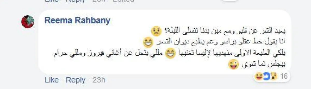 وانتهى نقاشها الحاد مع الشاب الذي وصف الألبوم بالفاشل ووصفته هي بالطبال والشاعر بسؤالها عنه في اليوم التالي، سؤال استتبع رداّ ممازحاً من أحد المعلّقين بأنّه انتحر لتردّ ريما "بعيد الشر عن قلبو ومع مين بدنا نتسلى الليلة؟ انا بقول حط عقلو براسو وعم يطبع ديوان الشعر. بلكي الطبعة الاولى منهديها لإليسا تغنيها. مللي بتحل عن أغاني فيروز ومللي حرام بيجلس تما شوي".