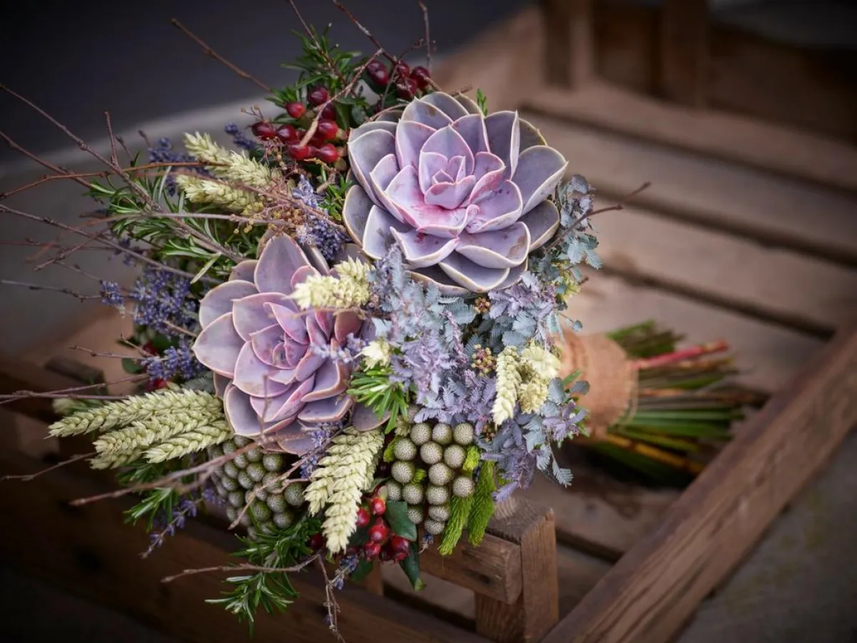 أزهار "العصاري" العتيقة: تُعتبر باقة أزهار العروس المزيّنة بنبات " SUCCULENTS"، من الباقات اللافتة وغير التقليدية، والتي تتناسب مع العروس الكلاسيكية لاطلالة مملوءة بالأرستقراطية، والباقة بإمكانها أن تكون مؤلفة من نباتات العصاري مع الأزهار المجففة، أو الأزهار الطبيعية بالألوان الدافئة.