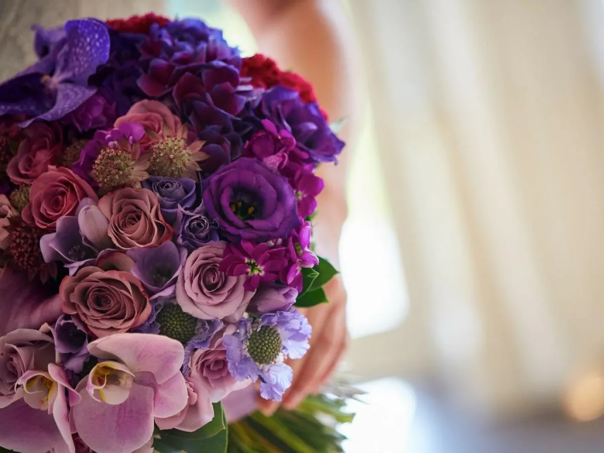 الأزهار البنفسجية "ULTRA VIOLET": باقة الأزهار البنفسجية مع لمسات من الأزهار الصغيرة البيضاء، تتربع على عرش قائمة أزهار باقات الزفاف للموسم الحالي، هذا الظل الساحر يتجاوز المواسم، ويطرح نفسه بقوة ليمنحكِ اطلالة دافئة واستثنائية، وبإمكانكِ إدخال اللون الأخضر معها لجعلها أكثر حيوية.