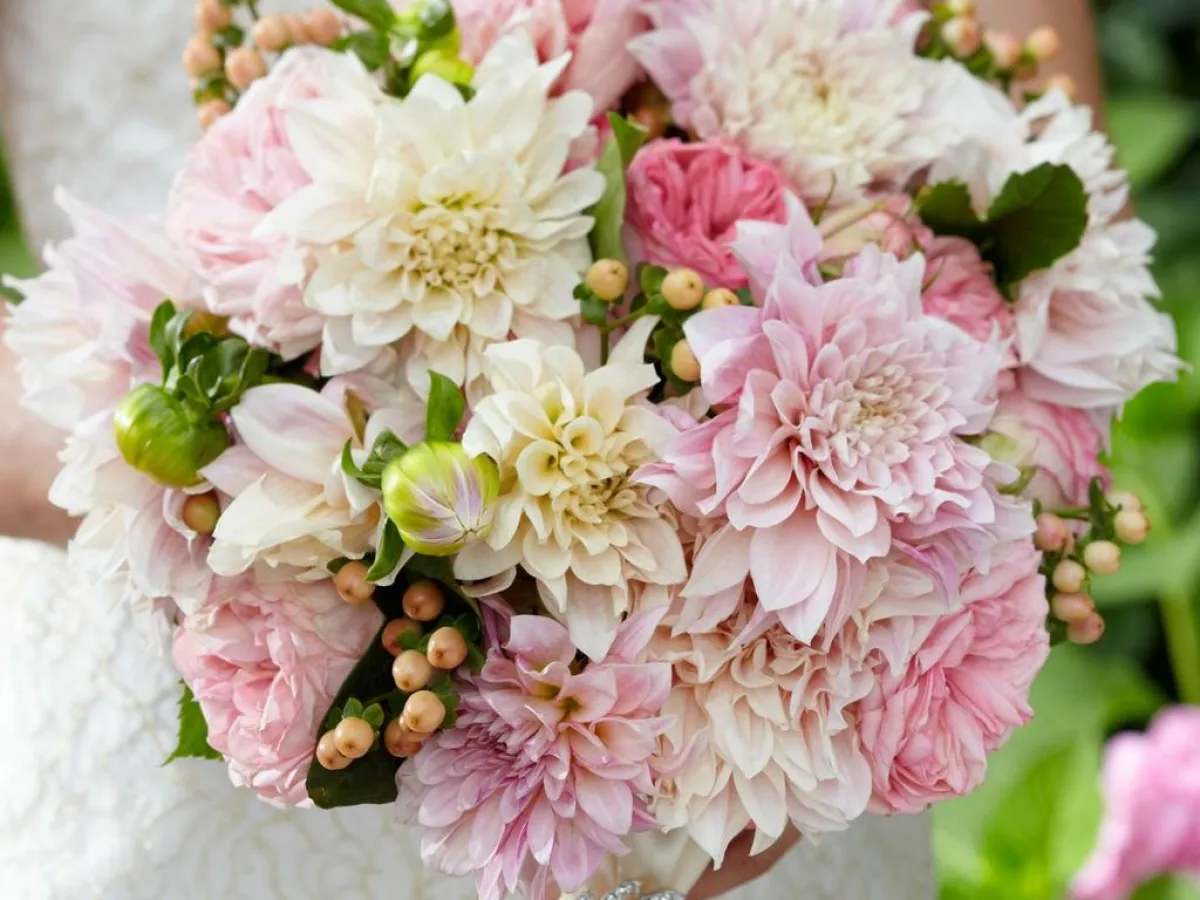باقة العروس من أزهار " DARLING DAHLIAS ": تتمتع تلك الزهرة الساحرة بأنها تمثل صيحة من الطراز القديم، إلا أنها هذا العام، جاءت بتصميم عصري لتتصدر قائمة رغبة الكثير من العرائس، وتأتي مع مجموعة واسعة من الألوان، ما يجعلها واحدة من زهور الزفاف الأكثر تنوعًا في التنسيق.