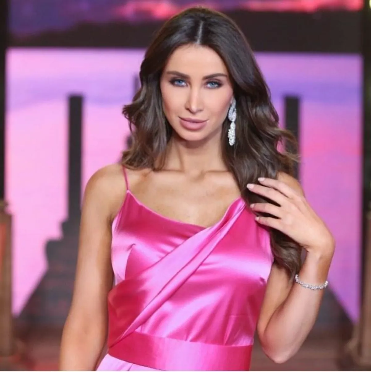 اطلالة أنابيلا الطويلة صُمّمت من الساتان الزهري مع الحزام الناعم عند الخصر، أما الحذاء فاختارته من دار فرساتشي Versace باللون الفضّي، كما اختارت أقراطًا وخاتمًا وسوارًا من الماس الأبيض من مجوهرات زغيب.