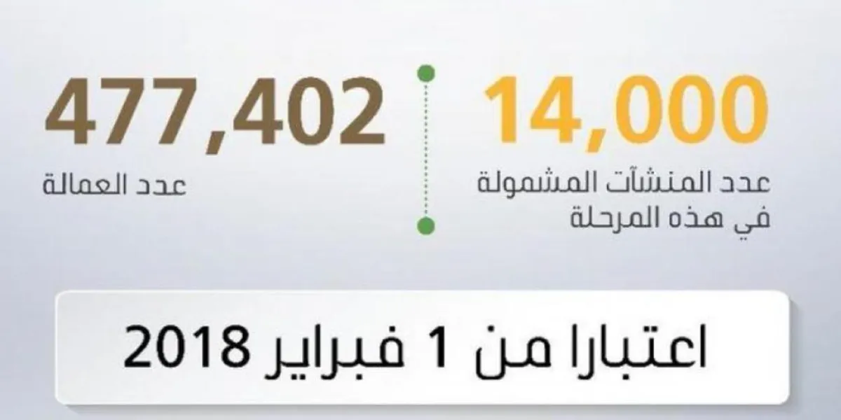 ووفقاً لوزارة العمل، فإن تلك المرحلة تشمل المنشآت التي تتراوح عمالتها بين 30 و39 عاملاً، وقدرت الوزارة عدد المنشآت المشمولة في هذه المرحلة بـ 14 ألف منشأة بعدد عمالة يبلغ نحو 477.402 من العمال.