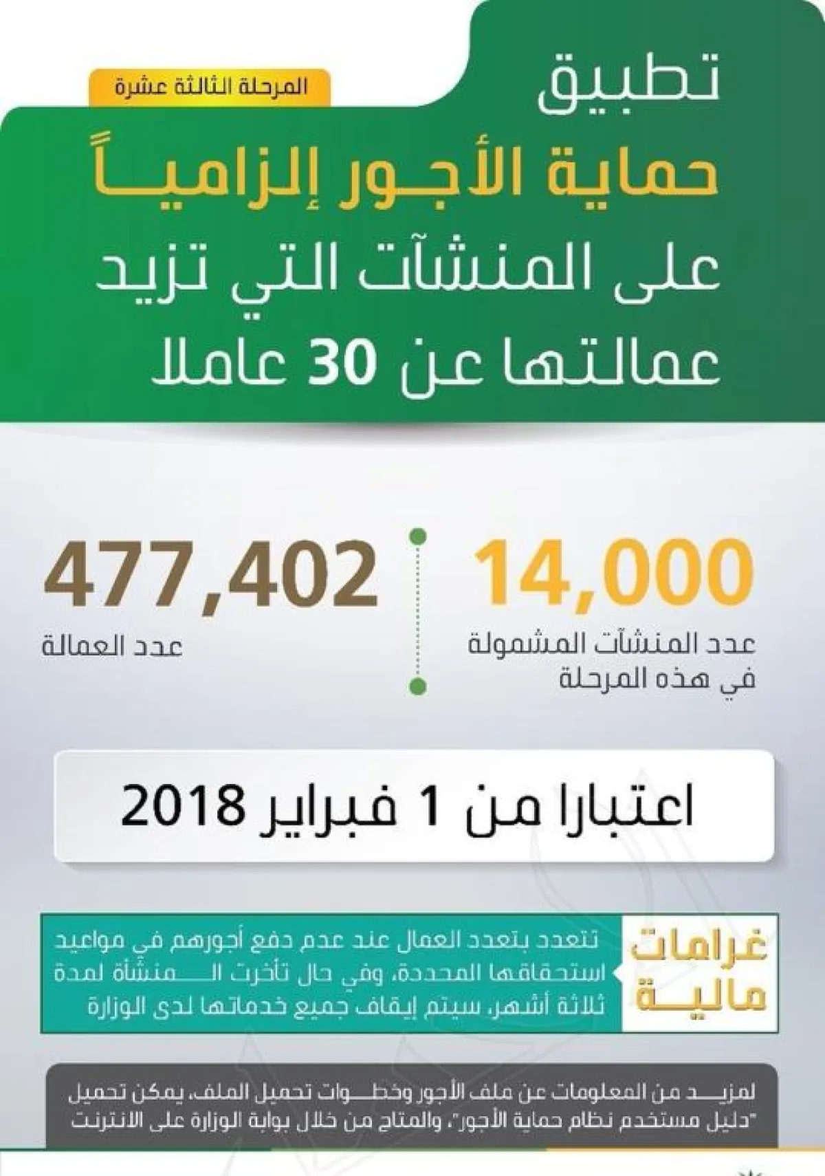 تعتزم وزارة العمل والتنمية الاجتماعية البدء في التطبيق الإلزامي للمرحلة الـ 13 من برنامج «حماية الأجور»، اعتباراً من الأول من فبراير المقبل الموافق 15 جمادى الأولى 1439هـ.