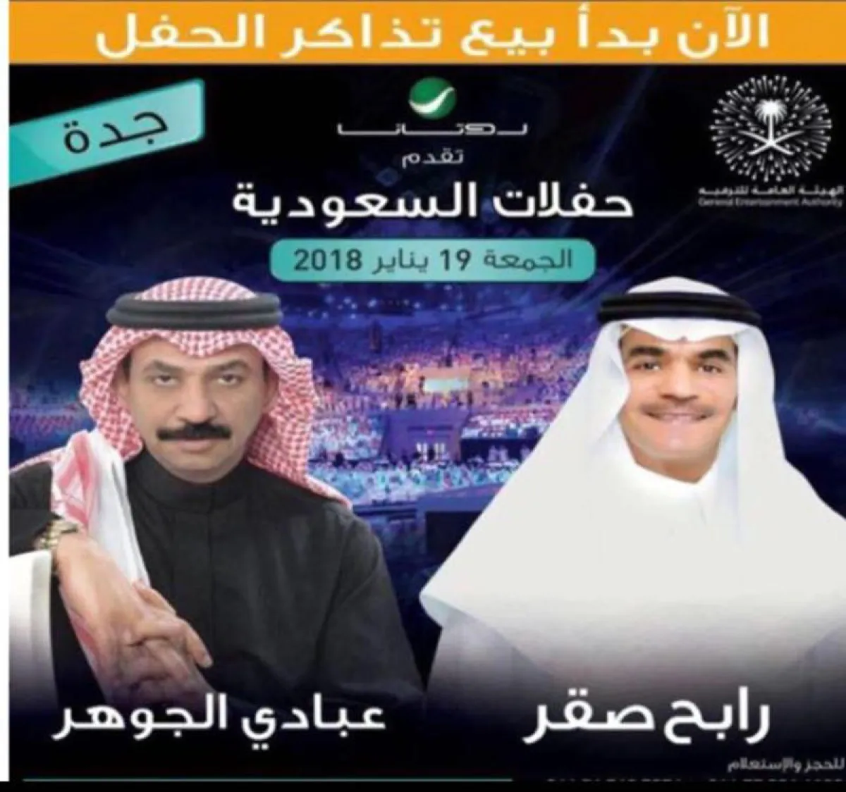 ضمن "حفلات السعودية" التي تنظمها شركة "روتانا" بدعم من الهيئة العامة للترفيه يحيي الفنانان د. عبادي الجوهر وعبد الله الرويشد مساء غداَ (الخميس18-1-2018) حفلته الأولى في الدمام. ويوم الجمعة 19 يناير جمهور جدة على موعد مع الجوهر في حفلته الثانية في الصالة "المغطاة" بملعب الجوهرة بمدينة الملك عبد الله الرياضية بجدة، ويشارك معه الفنان رابح صقر، أي أن الفنان عبادي الجوهر سيحلق بأغنياته وجمهوره بين الشرقية والغربية، ما بين الدمام وجدة في ليلتين متتاليتين، وهي الحفلة التي كانت مقررة بتاريخ (23-11-2017) وتمّ تأجيلها بسبب الأمطار الغزيرة التي هطلت على مدينة جدة، وحالت دون وصول الفرقة الموسيقية إلى جدة في الموعد المحدد لإجراء البروفات. وكان من قبل قيل إن الحفلة سيحييها الفنانان عبادي الجوهر ونبيل شعيل ووليد الشامي، لكن يبدو أن ثمّة ظروفاً حالت دون مشاركة نبيل شعيل ووليد الشامي، ليشارك الفنان رابح صقر مع الفنان عبادي الجوهر، وهما اللذان يملكان جماهيرية في المنطقة الغربية والسعودية وخارجها.