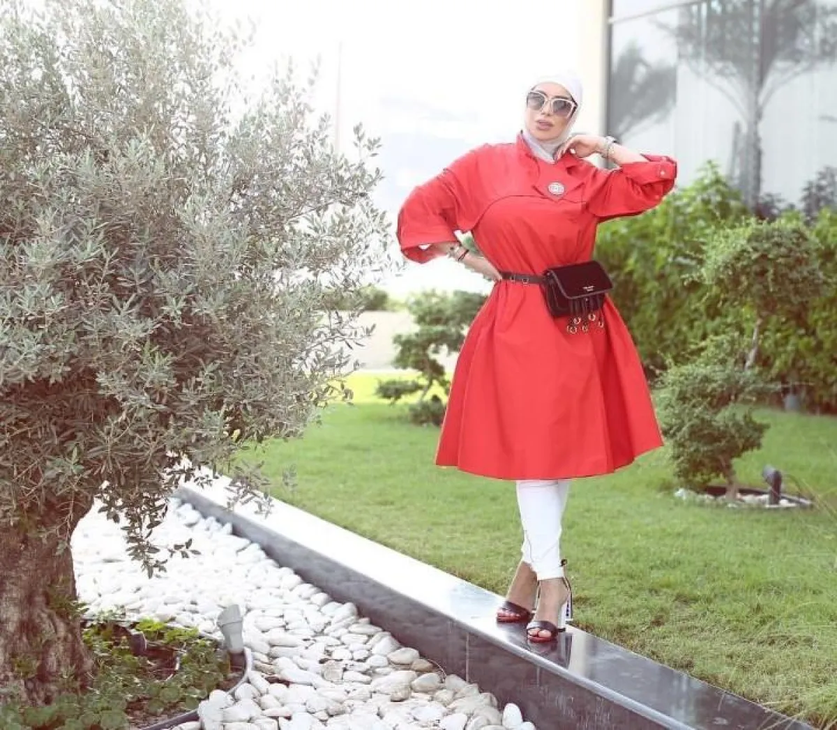 الفاشينيستا المحجبة زينب حمّود اختارت حقيبة يد حمراء على خصرها من غوتشي Gucci.