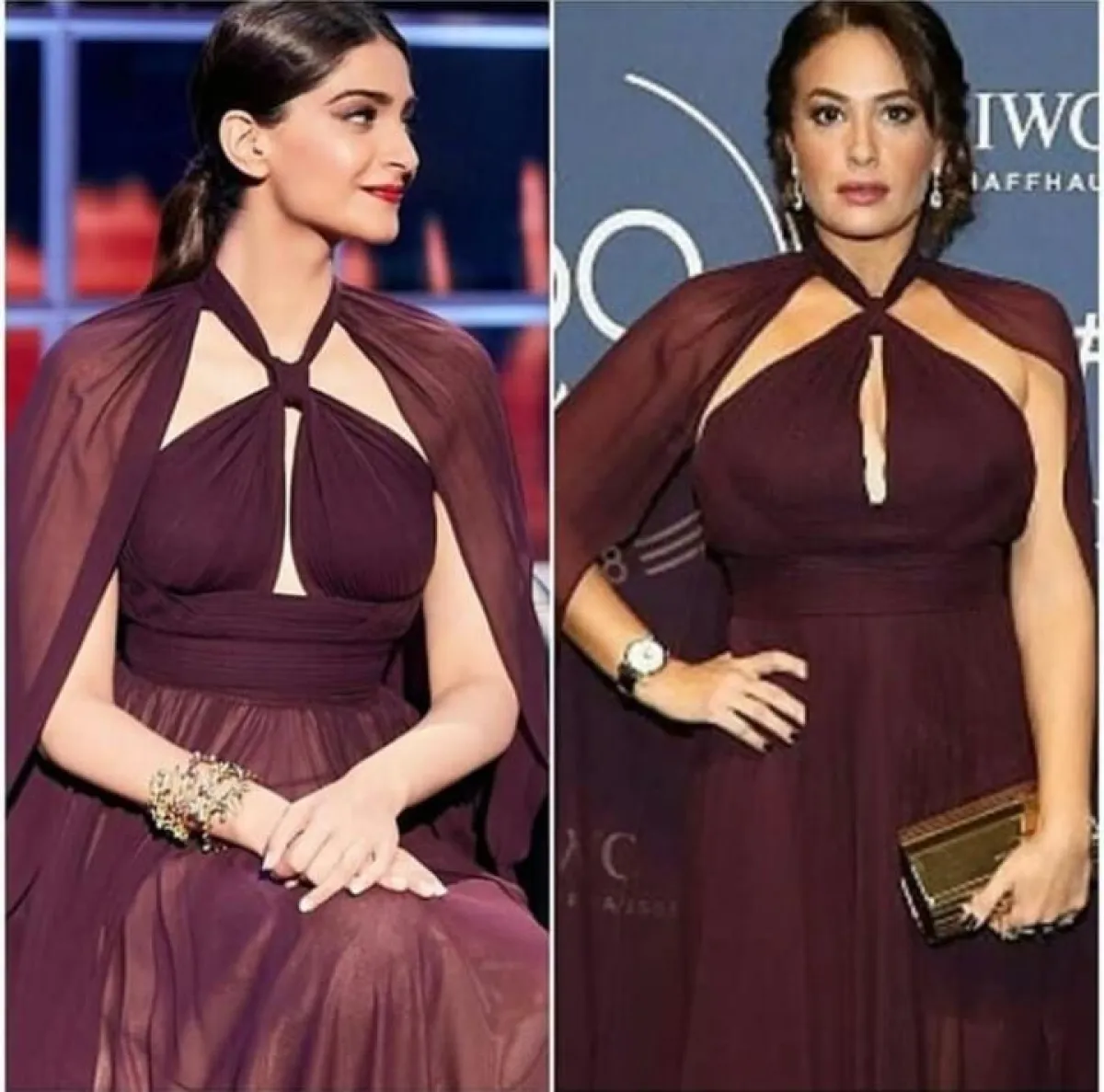اطلالة هند وسونام تميزت بأقمشة الشيفون باللون الأحمر القاتم القريب من البنّي، كما تميز التصميم بالأكتاف المكشوفة والصدر المكشوف عند الوسط.
