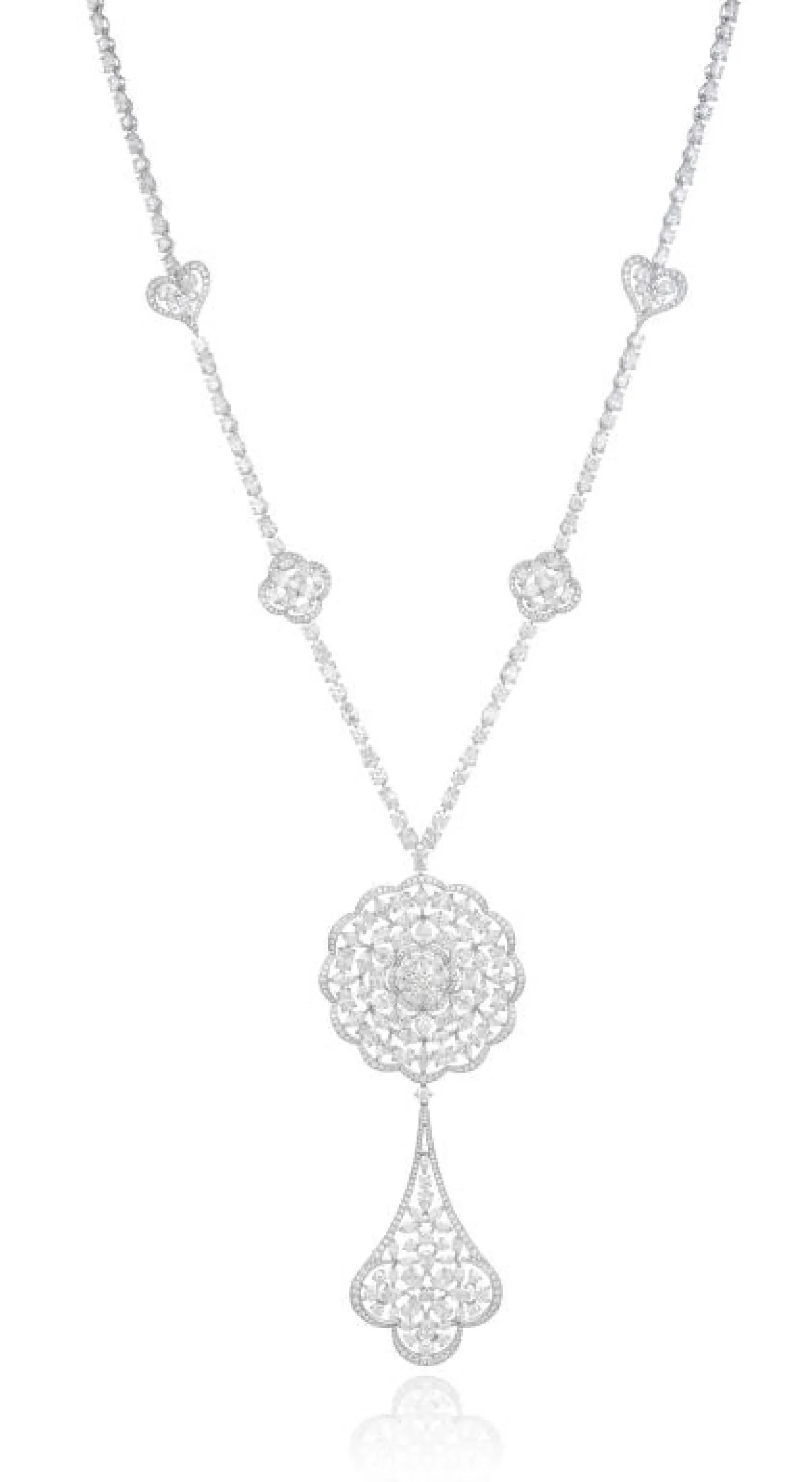 مثل الأقراط المتدلية المصنوعة من الذهب الأبيض والمرصعة بالألماس من مجموعة “سيغنتشور دو شانيل” Signature de Chanel من “شانيل” Chanel، أو الخاتم المبتكر التصميم على شكل وردة ناعمة من مجموعة “روز” من Rose من “ديور فاين جولري” Dior Fine Jewelry، أو السوار العريض المرصع بحبات الألماس الناعمة من مجموعة “مانشيت بيرله” Manchette Perlee من “فان كليف أند آربلز” Van Cleef&Arples، أو العقد المميز الطويل من مجموعة “ريد كاربت” Red Carpet من “شوبارد” Chopard.