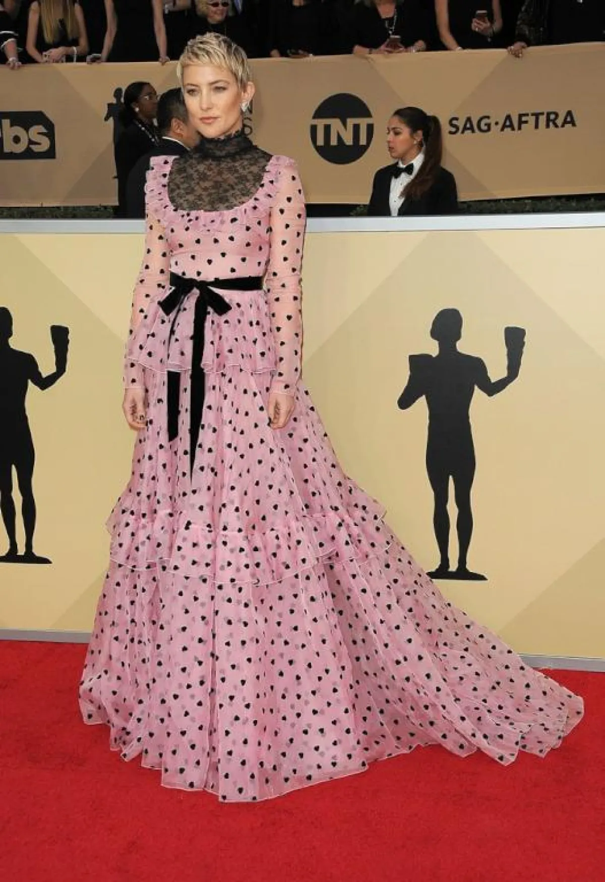 أما كايت هادسون Kate Hudson فقد اختارت فستاناً من فالنتينو Valentino بتصميم أنثوي ساحر، بدا منسجماً جداً مع قصة شعرها القصيرة حيث استطاعت أن تحدث تناقضاً جميلاً ولافتاً في طلّتها.