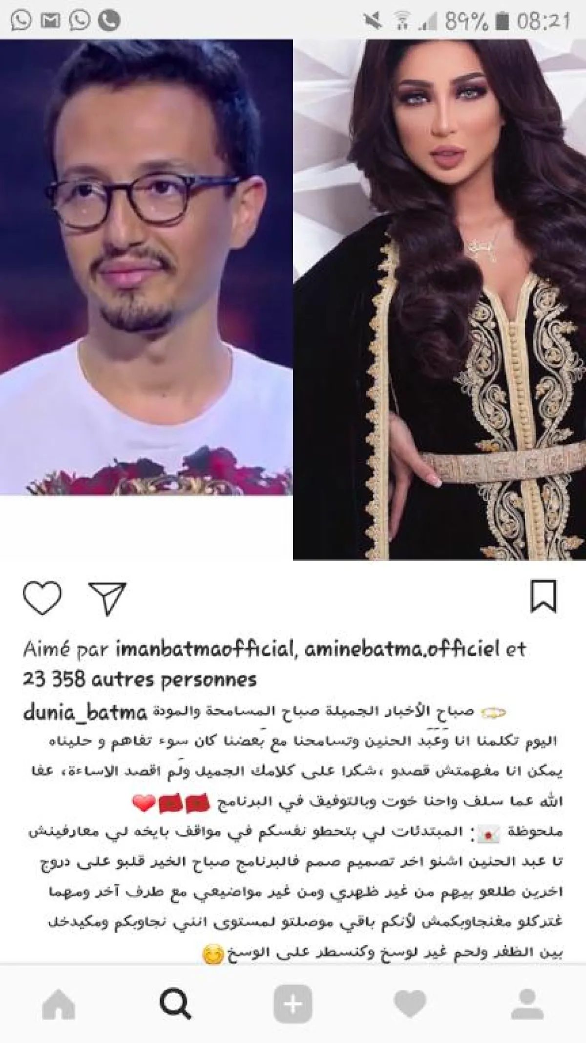 ونشرت أم غزل، عبر صفحتها الرسمية بتطبيق الصور "إنستقرام" صورة مركبة لها ولعبد الحنين، وأرفقتها بتدوينة قالت فيها صباح الأخبار الجميلة صباح المسامحة والمودة... اليوم تكلمنا أنا وعبد الحنين، وتسامحنا مع بعضنا. كان سوء تفاهم وحليناه، يمكن أنا مفهمتش قصدو، شكرا على كلامك الجميل ولم أقصد الإساءة، عفا الله عما سلف، واحنا خوت، وبالتوفيق في البرنامج.