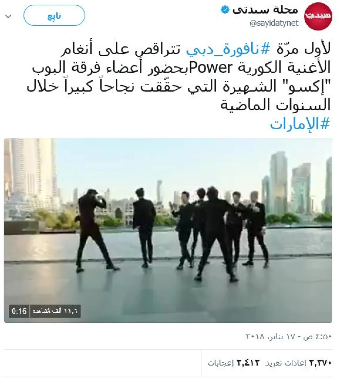 الجدير بالذكر أن سيدتي نشرت مقطعاً على حسابها في موقع التواصل الاجتماعي تويتر، للفرقة وهي تتراقص أمام نافورة دبي على الأغنية الكورية Power، وحظيت التغريدة بـ 2,370 إعادة تغريد و2,412 وعدد مشاهدات تجاوز 11,500 ألف.