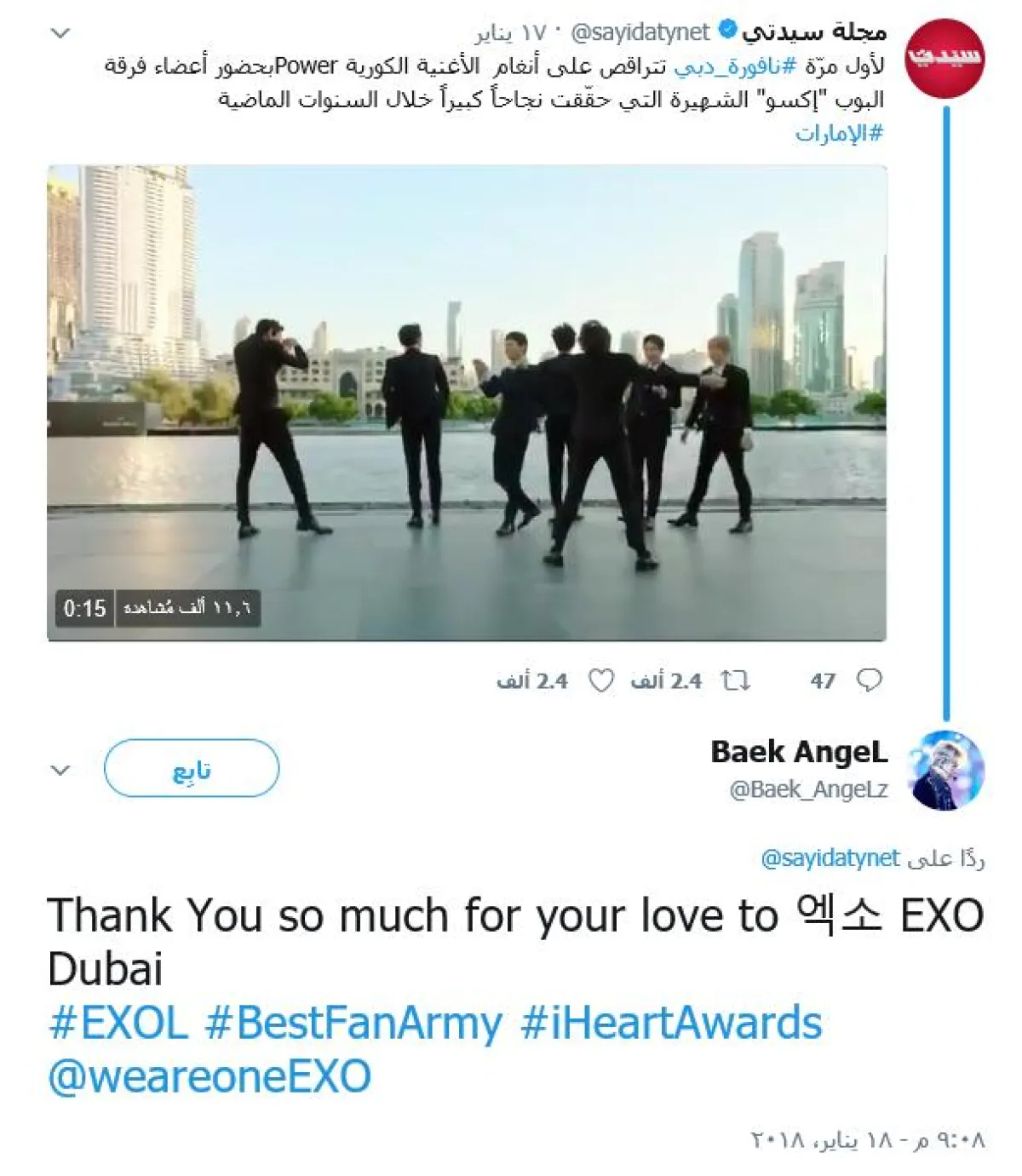 وآخر باسم Baek Angel غرد قائلا: «Thank you so much for your love to EXO Dubai