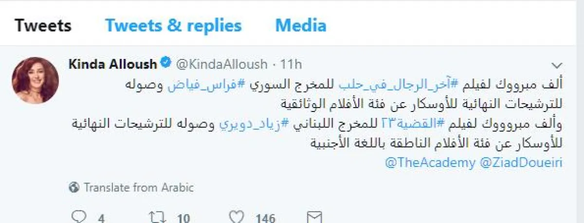 كنده غردت عبر حسابها الموثق بموقع تويتر قائلة : "ألف مبروك وصول فيلم "آخر الرجال في حلب"، للترشيحات النهائية للأوسكار عن الأفلام الوثائقية.. ألف مبروك للمخرج فراس فياض".