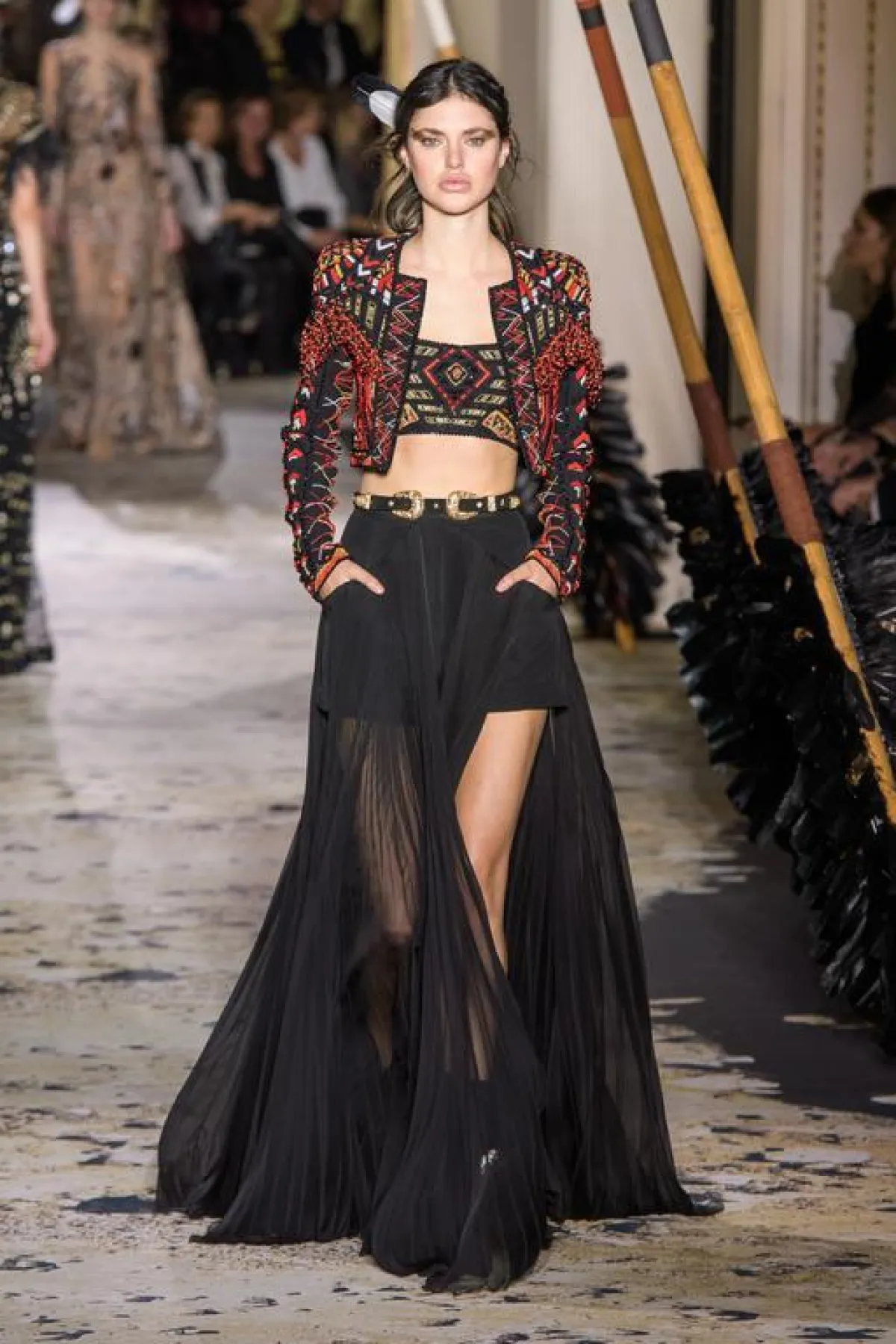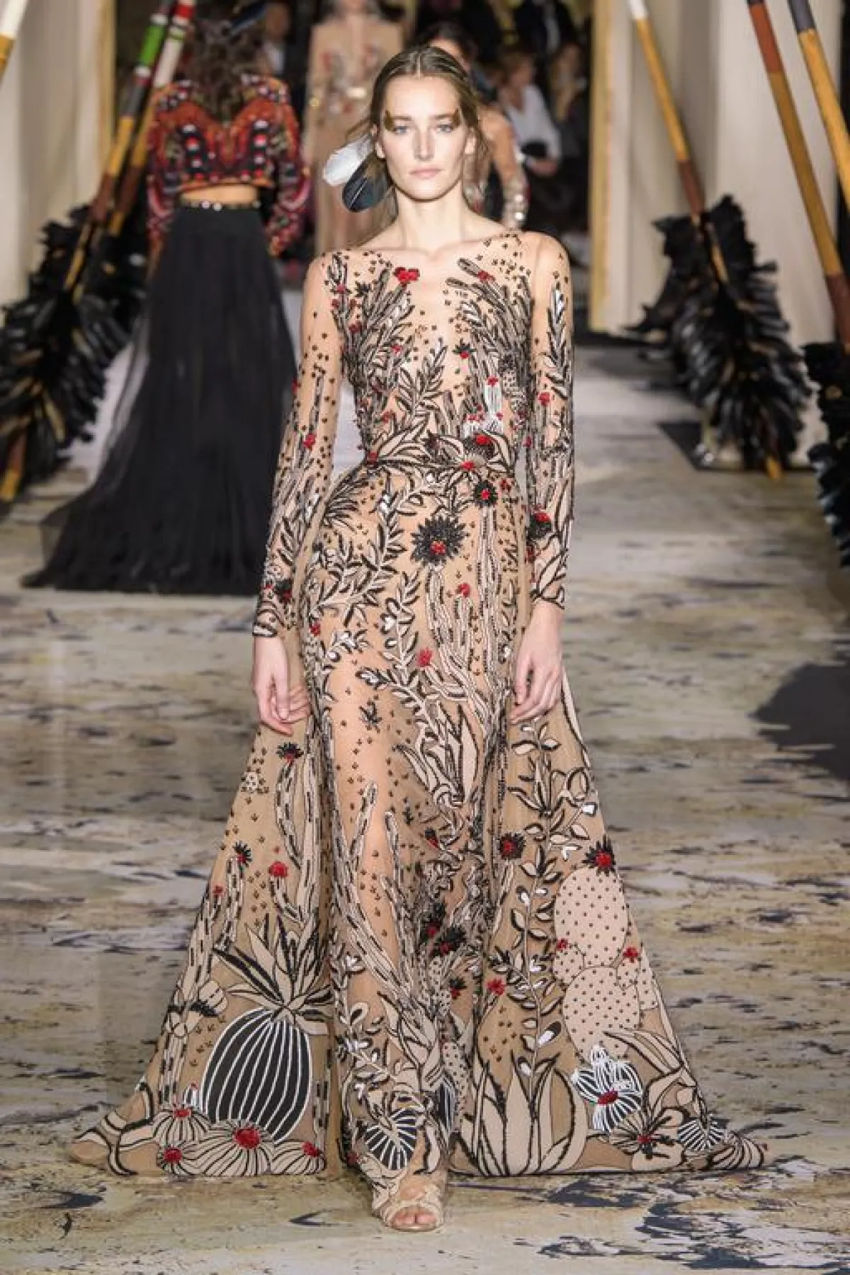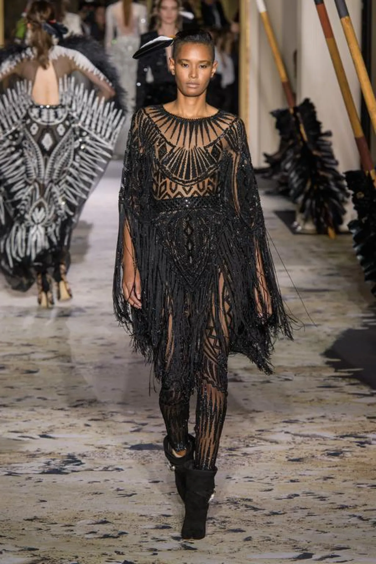 من جهته، غاص المصمم زهير مراد في ثقافة الهنود الحمر، حيث استوحى جماليات الأزياء التي عرضها من قصات فساتين المرأة في هذا المجتمع، وجسدها في فساتين سهرة طويلة غاية في الأناقة غلب عليها قماش الدانتيلا الأبيض ونسقت مع أحذية جلدية طويلة من نفس اللون. وقد جاءت فساتينه الأخرى مطرزة برسومات وخطوط متمايلة استوحاها من الرسومات والخطوط التقليدية لأزياء الهنود الحمر، وزين معظمها بالريش الناعم، واتسمت بفتحات على مستوى الساقين والأكتاف.