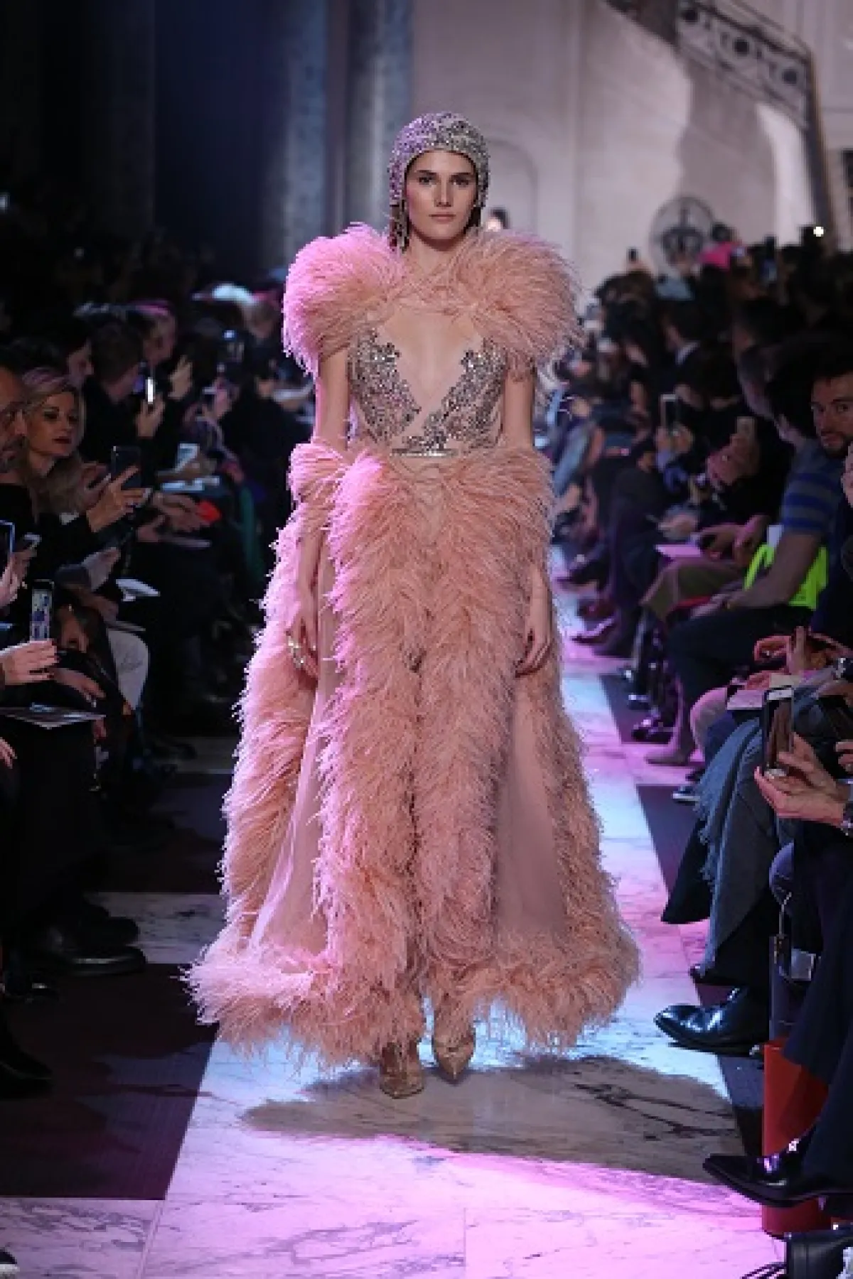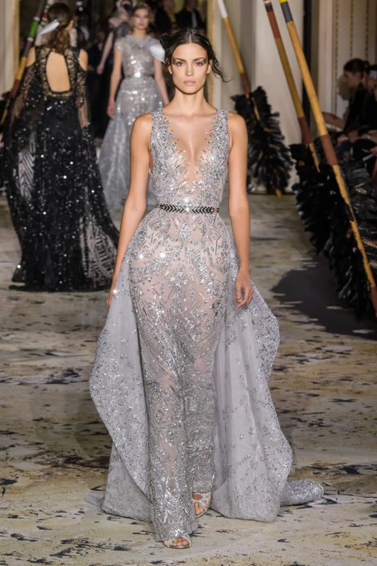 كعادته أبهر إيلي صعب جمهوره بالتنوع الكبير في القصات والتفاصيل الجمالية، حيث تلاعب بشكل محكم بين مختلف الأشكال الهندسية التي استوحاها من فن "الأرت ديكور"، ورسومات الأزهار الغنية بتطريزات الخرز والأحجار التي طعم بها كل فساتينه. كما أنه استعمل الريش بقوة، حيث كان يتطاير طوال العرض مصاحبا حركات العارضات اللواتي جسدن بطريقة مشيتهن الحرية التي طبعت الحقبة الذهبية الباريسية.