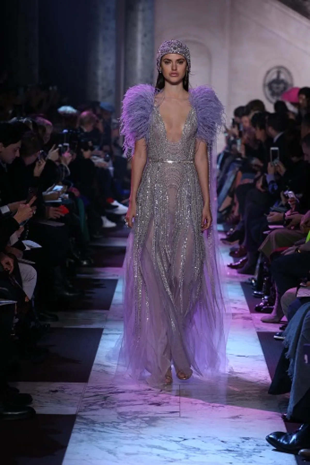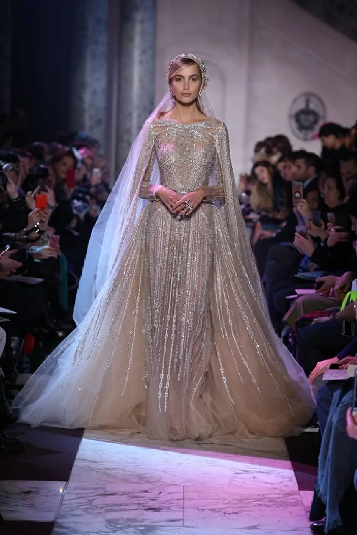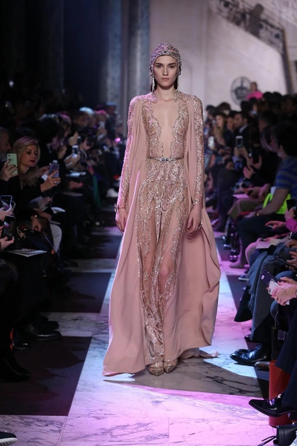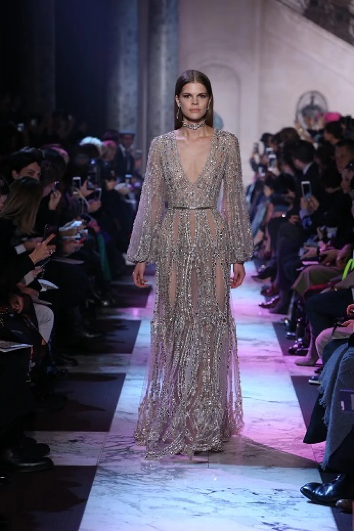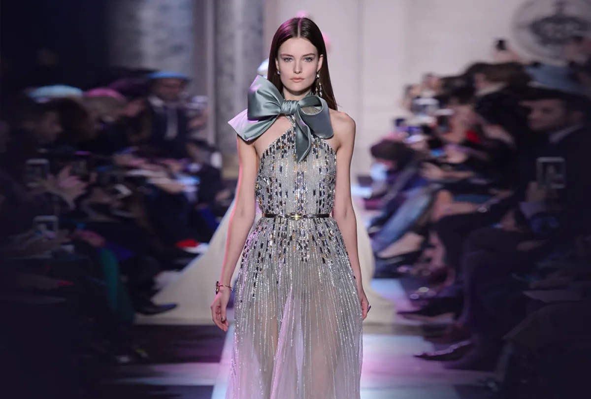 أما المصمم إيلي صعب، فقد أخذنا في رحلة الى باريس في حقبة العشرينات من القرن الماضي، حيث عكس وهج وبذخ هذه الحقبة من خلال فساتين خطفت الأنظار بألق ترصيعاتها وأقمشتها البراقة. وعلى وقع موسيقى الجاز، تهادت العارضات بفساتين تضج بالتفاصيل الأنثوية التي ترمز إلى الحرية والاحتفالية التي طبعت تلك الحقبة، حيث كانت المرأة الباريسية مصدر إلهام الكثير من الفنانين، وجسّد إيلي صعب تراث تلك الحقبة الذهبية في أزياء تضج أنوثة، سواء منها الفساتين ذات الفتحات الجريئة أو فساتين البوستييه التي طعمها بربطات الفراشة على مستوى الرقبة.