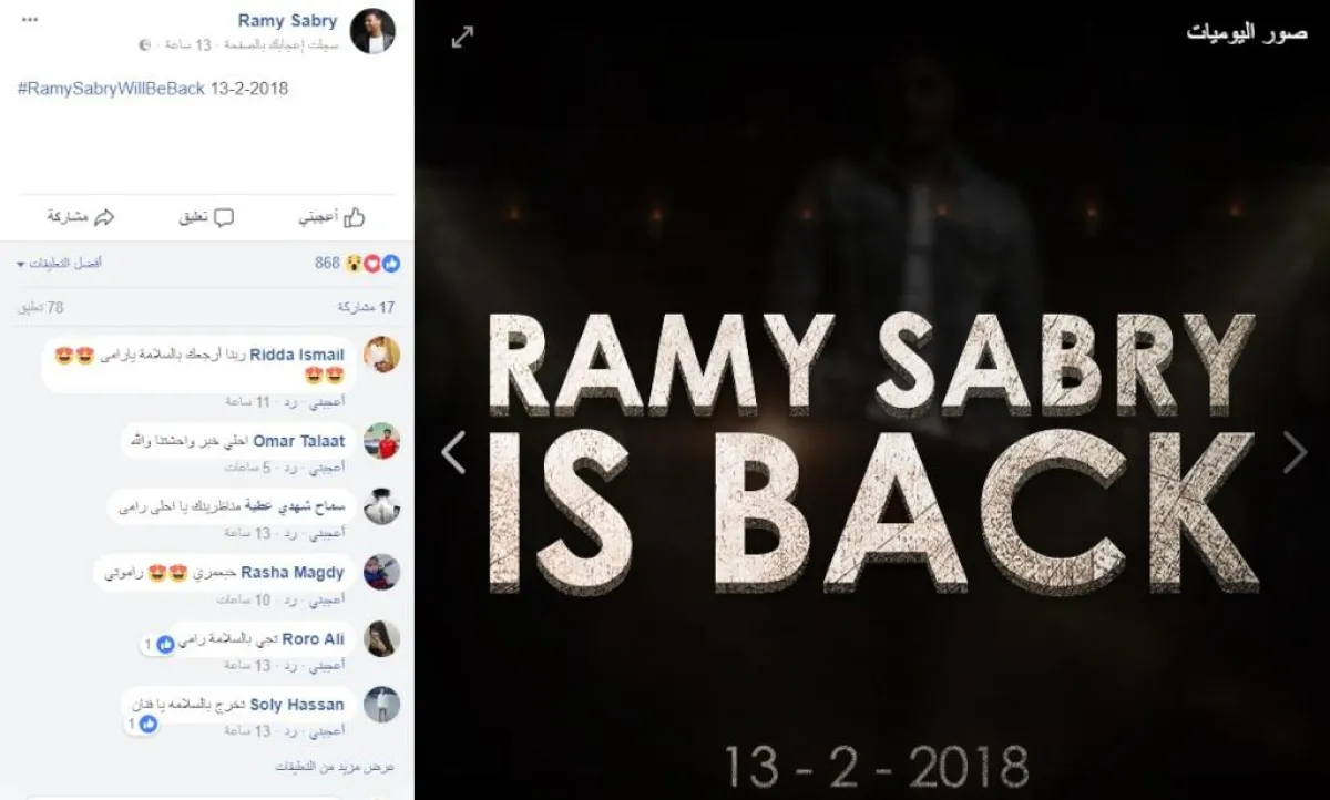 الحسابات الرسمية لرامي صبري على مواقع الفيس بوك وتويتر وانستقرام، مع روابط معجبيه تبنت من اليوم هاشتاق بعنوان #RamySabryWillBeBack كما تم تنظيم حملة لاعادة تداول أغنيات ألبومه الأخير "الراجل"، قبل تقديم رامي لأول حفلاته الفنية.