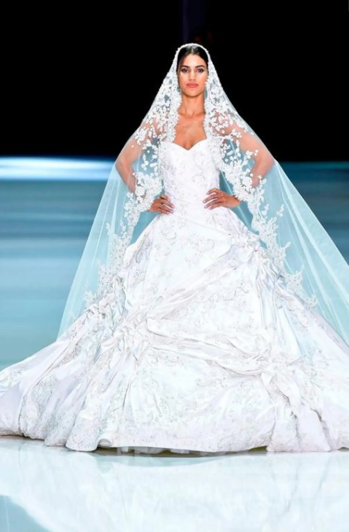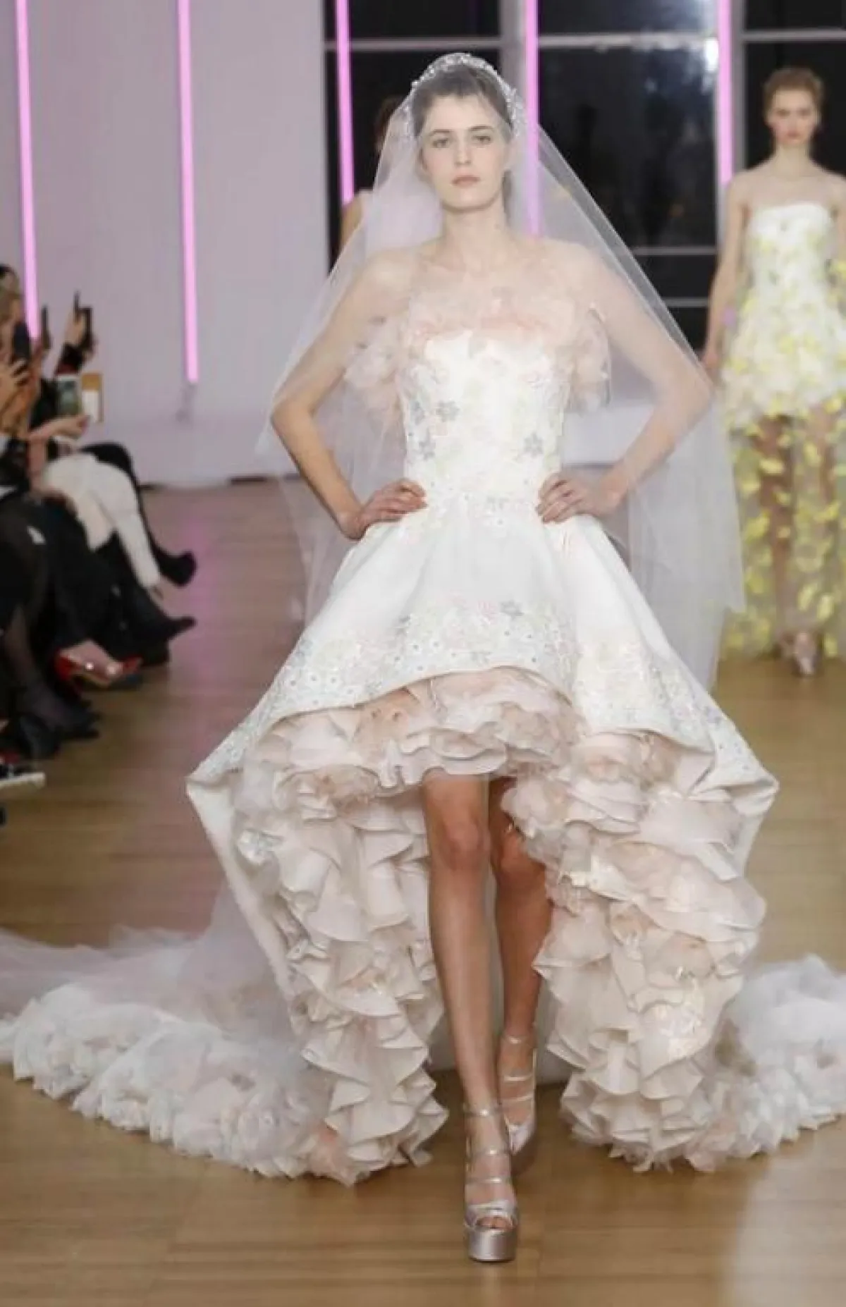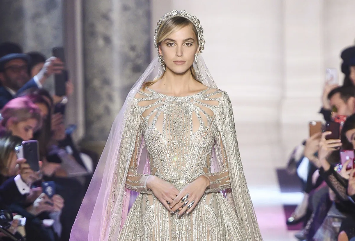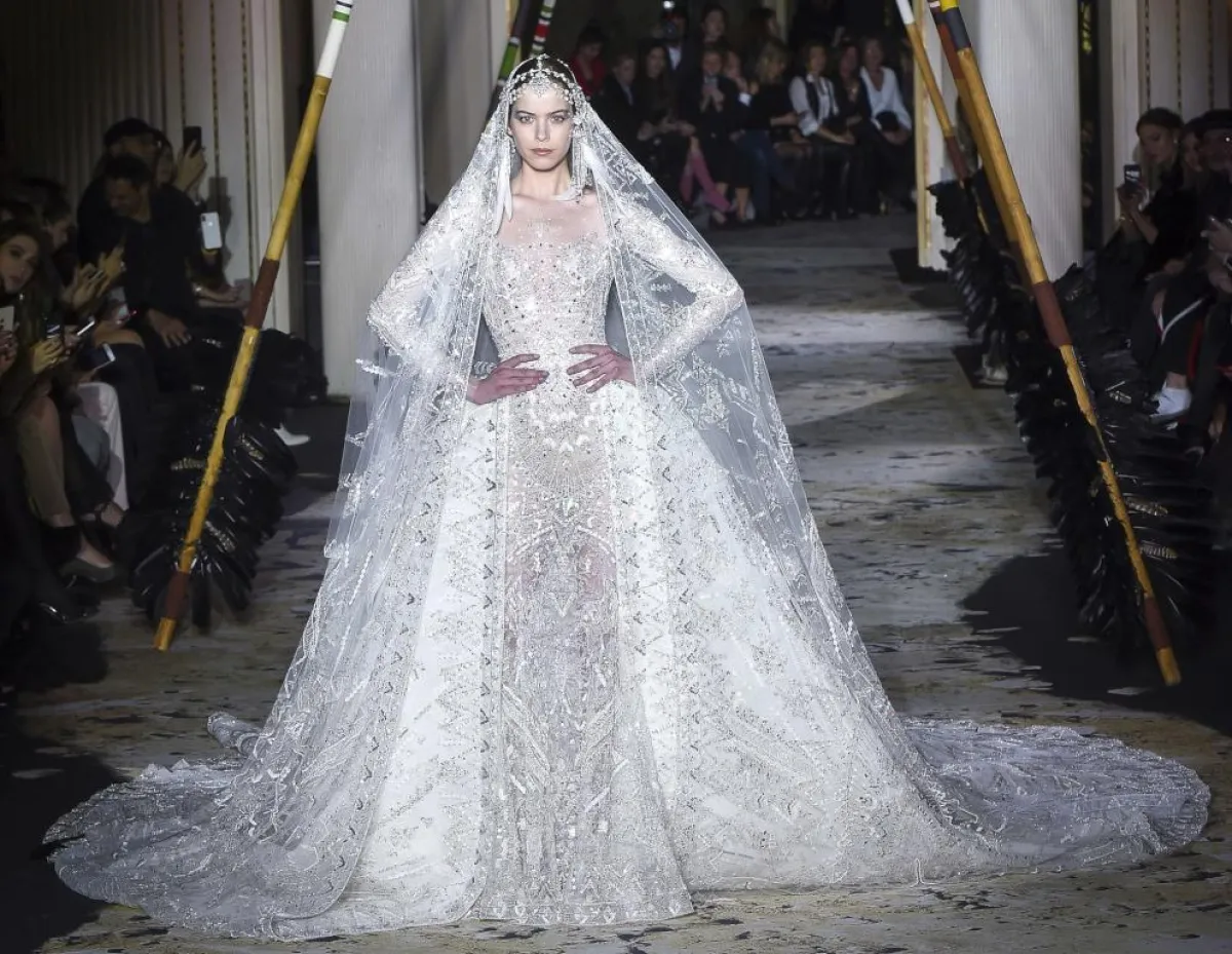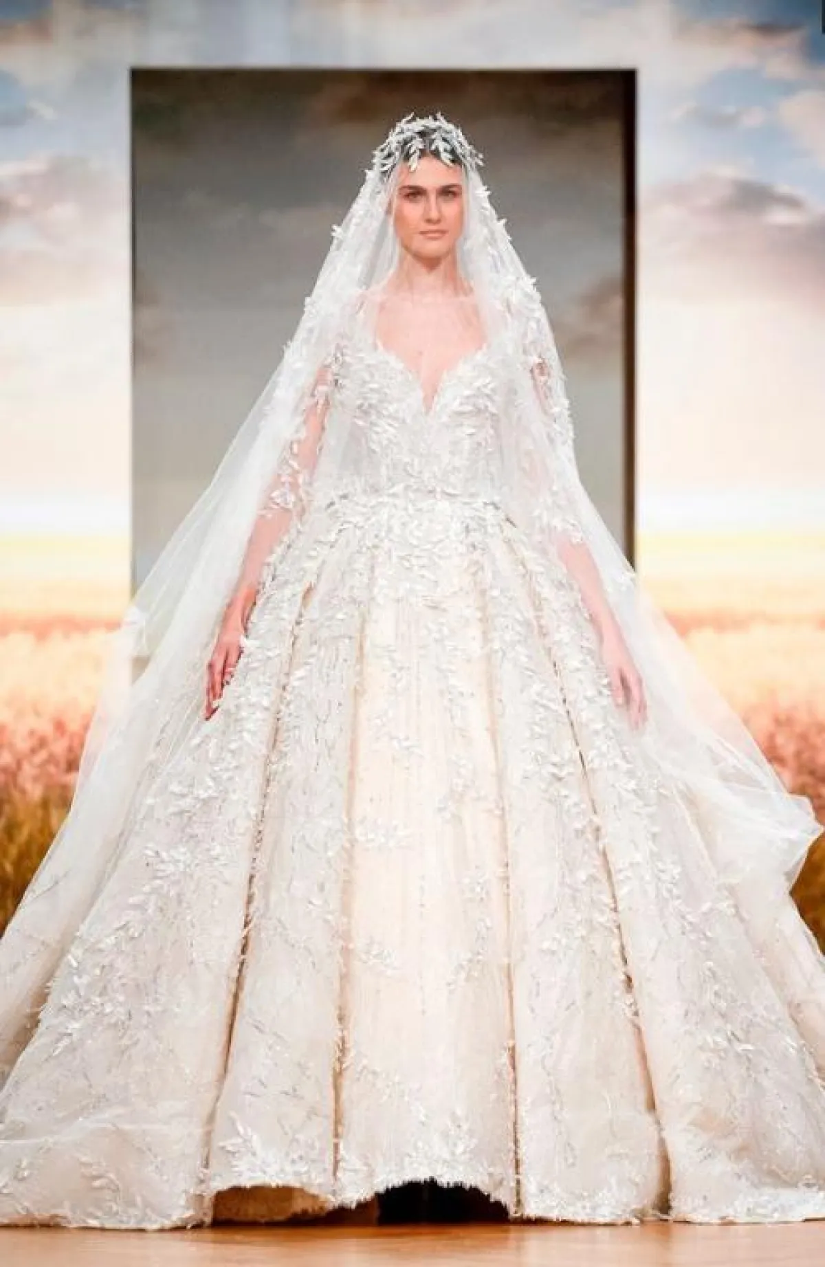إيلي صعب: تميزت عروس إيلي صعب بأنها هادئة وراقية. إمرأة مليئة بالأنوثة الصارخة. الثوب ضيق جداً، ينسدل على الخصر والوركين، مع تاج ناعم على الرأس.
