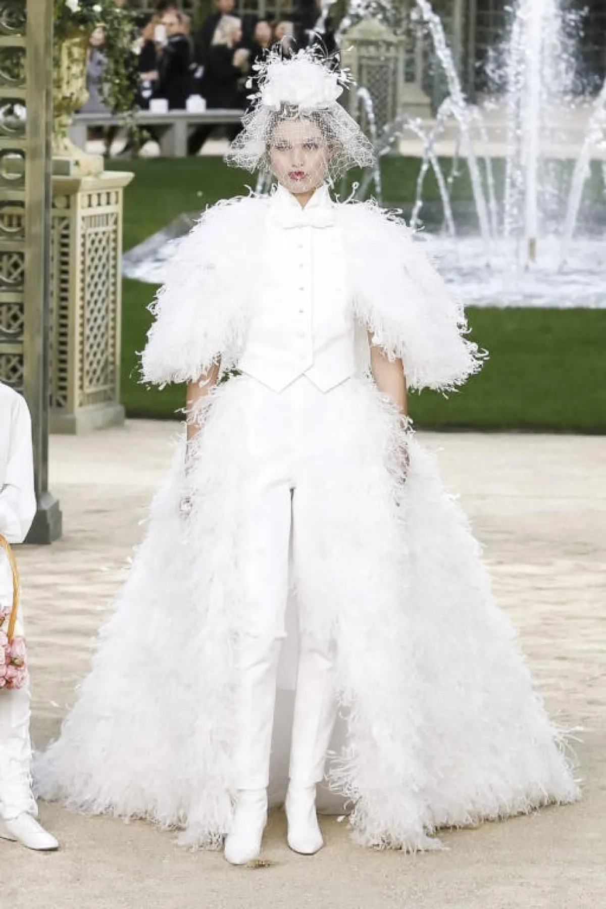 شانيل: خاطب دار «شانيل» العالمي العروس العصرية والعملية. كان ثوب الزفاف عبارة عن سروايل وبلوزة، مع ريش بارز في التصميم.