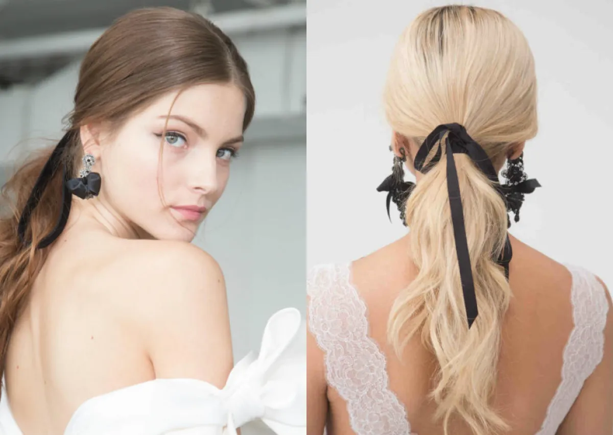 *تسريحة "ذيل الحصان" بالربطات السوداء: الشريط المخملي الأسود المصاحب لتصفيفة الشعر على هيئة ذيل الحصان المنخفض، مازال مستمرًا حتى هذا الموسم 2018 بشعبية كبيرة، لتكون هذه التسريحة مذهلة وعصرية مع فساتين الزفاف البيضاء.
