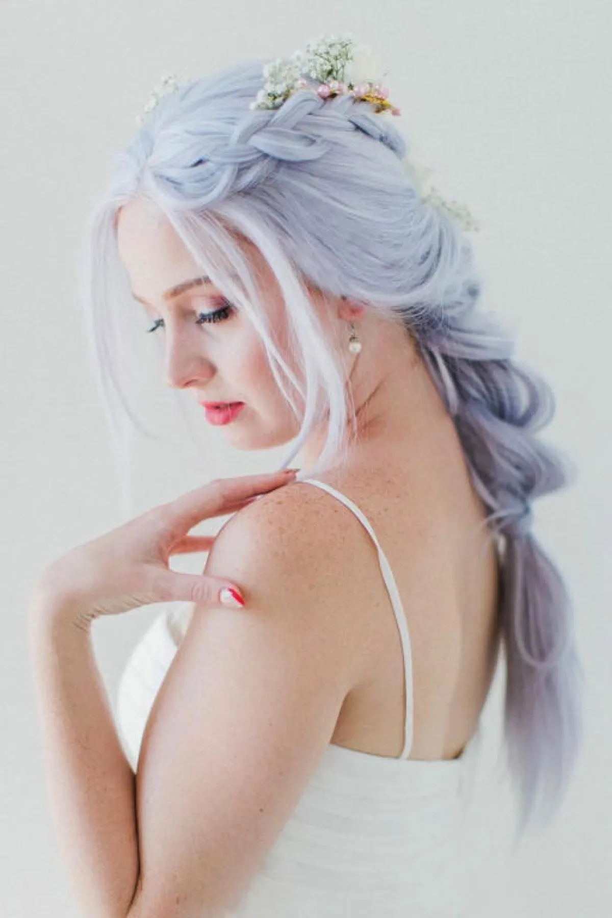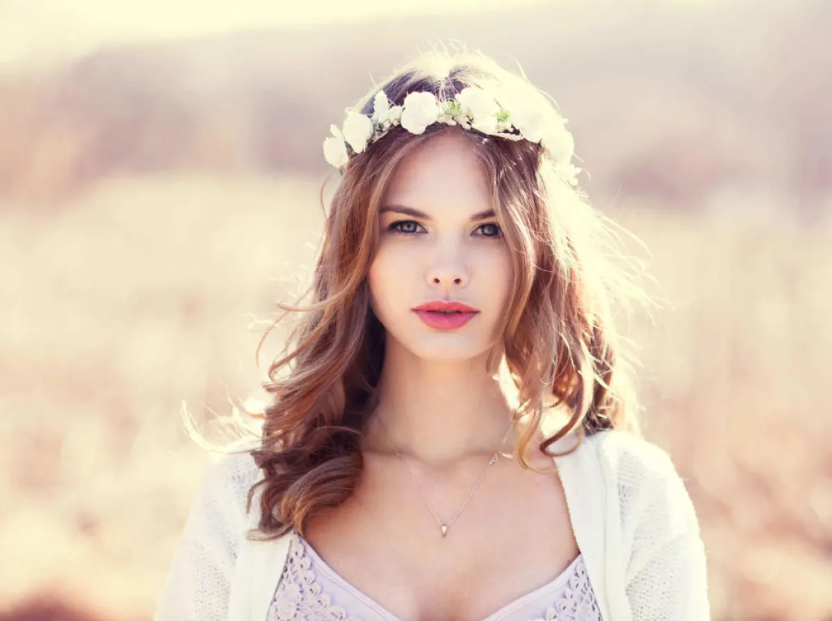 *تسريحة "الشعر المموج الطويل": نمط فوضوي راقٍ بطابع الحيوية والاسترخاء، يعطي انطباعًا شبابيًّا ومثيرًا كخيار مميز للعروس الشابة، ويتميز بخصلات الشعر المموجة المنسدلة للشعر الطويل، مع أطواق الأزهار بالألوان الربيعية الخلابة لإطلالة جاذبة.