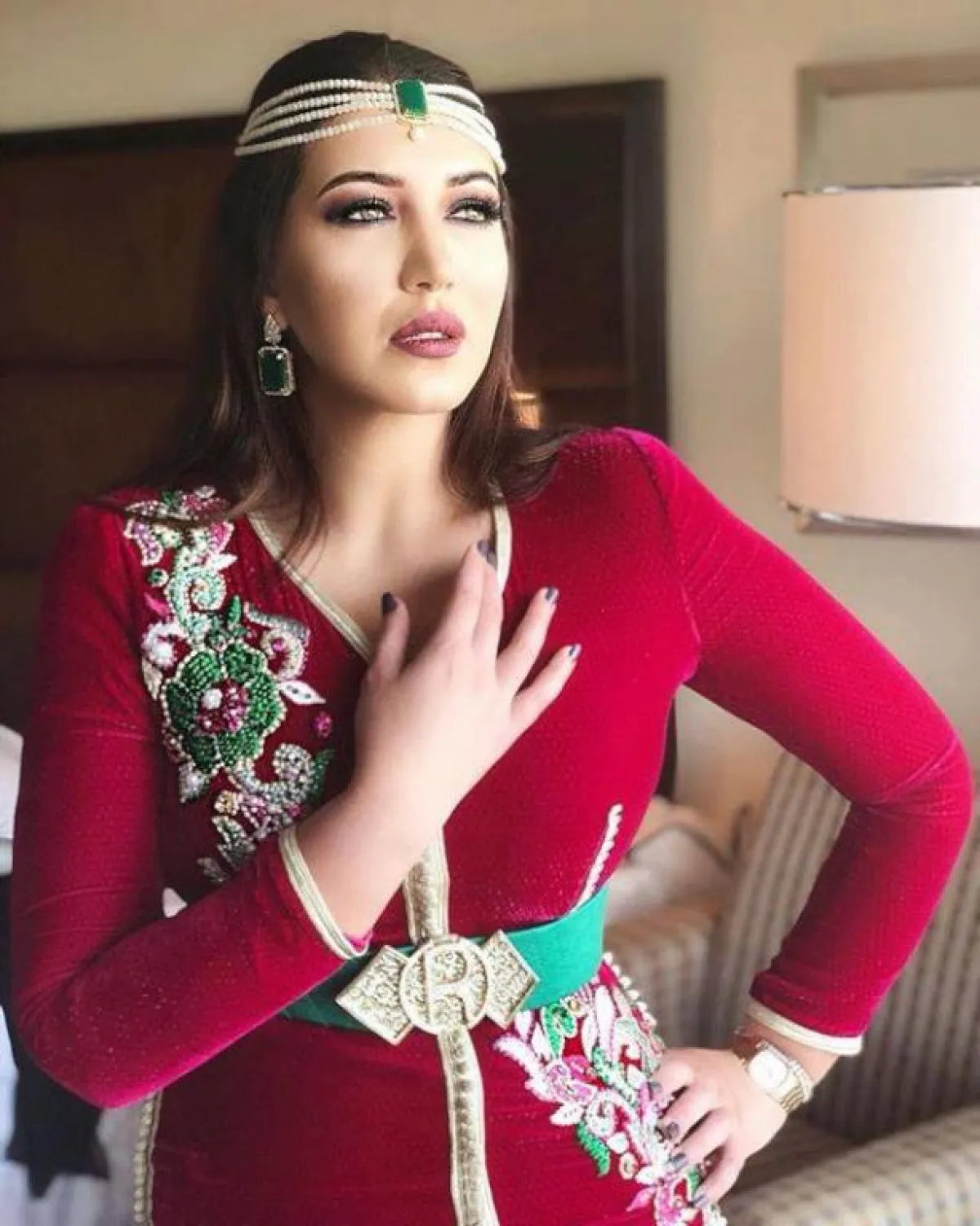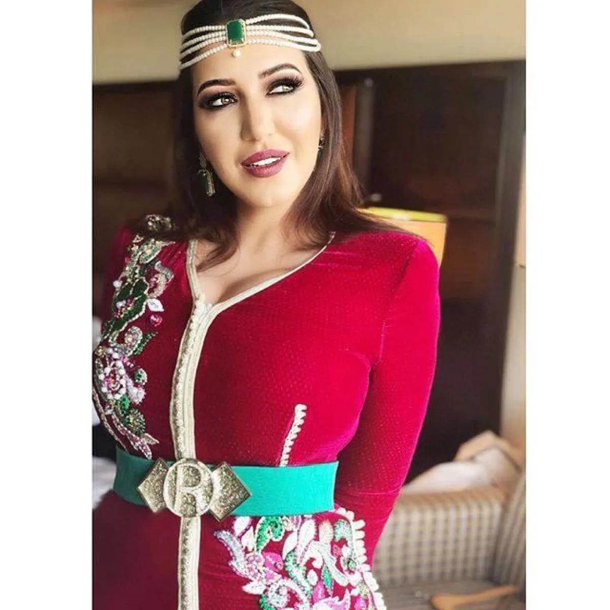 وتألقت أسماء المنور بقفطان مؤلف من قطعة واحدة باللون الأحمر مزين بتطريزات باللون الأخضر والوردي ومنبت بالعقيق ، واستكملت بحزام باللون الأخضر والذهبي أضفى مظهراً ناعماً عليها .