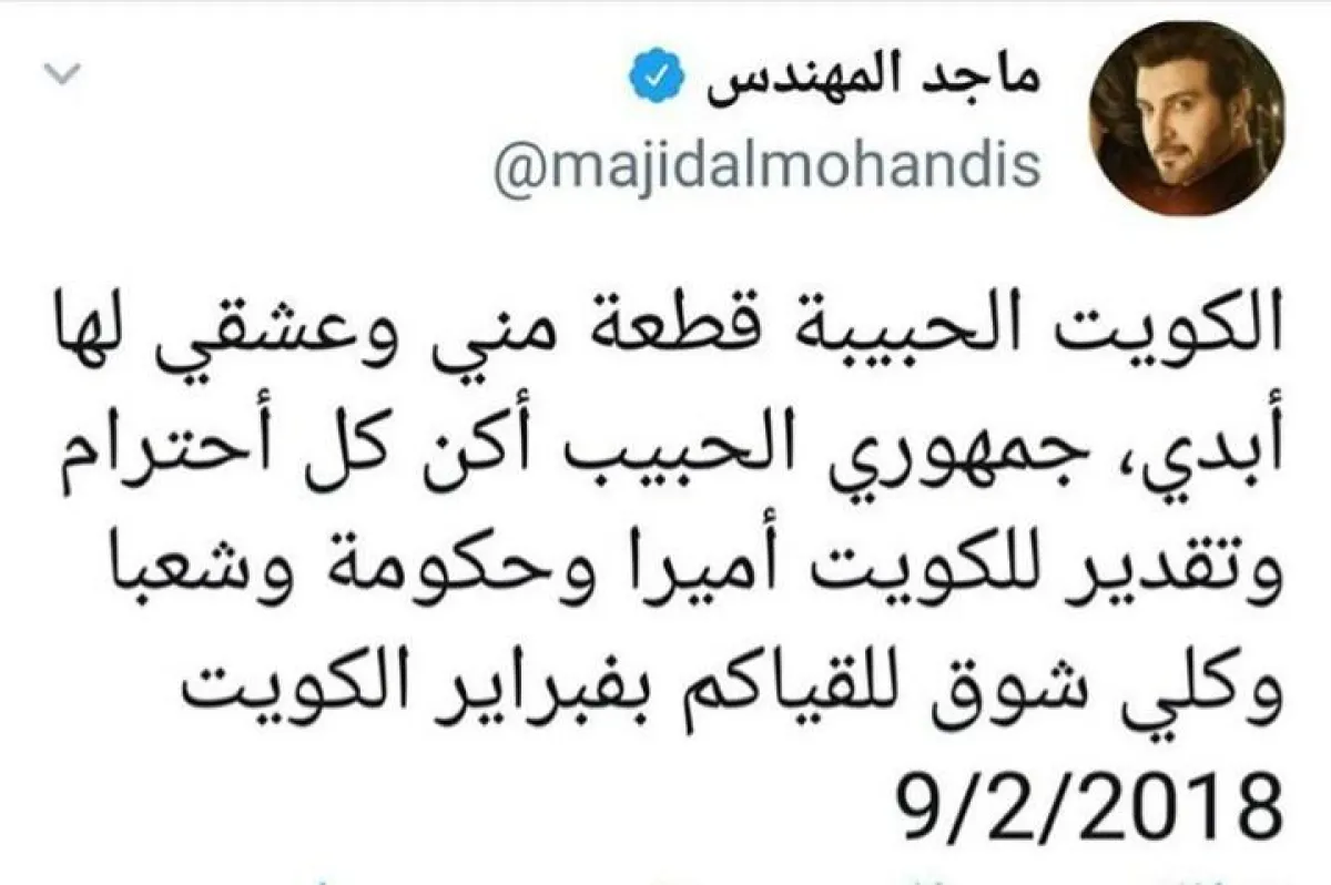 من ناحية أخرى نشر الفنان ماجد المهندس تغريدة عبر حسابه الرسمي على "تويتر" بعد انتشار شائعات عن عدم مشاركة بعض الفنانين في مهرجان " فبراير الكويت"، وكتب" الكويت الحبيبة قطعة مني وعشقي لها أبدي، جمهوري الحبيب أكن كل احترام وتقدير للكويت أميراً وحكومة وشعباً وكل شوقي للقياكم بفبراير الكويت 9\2\2018.