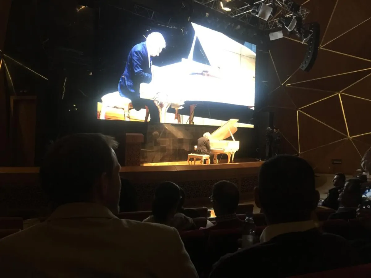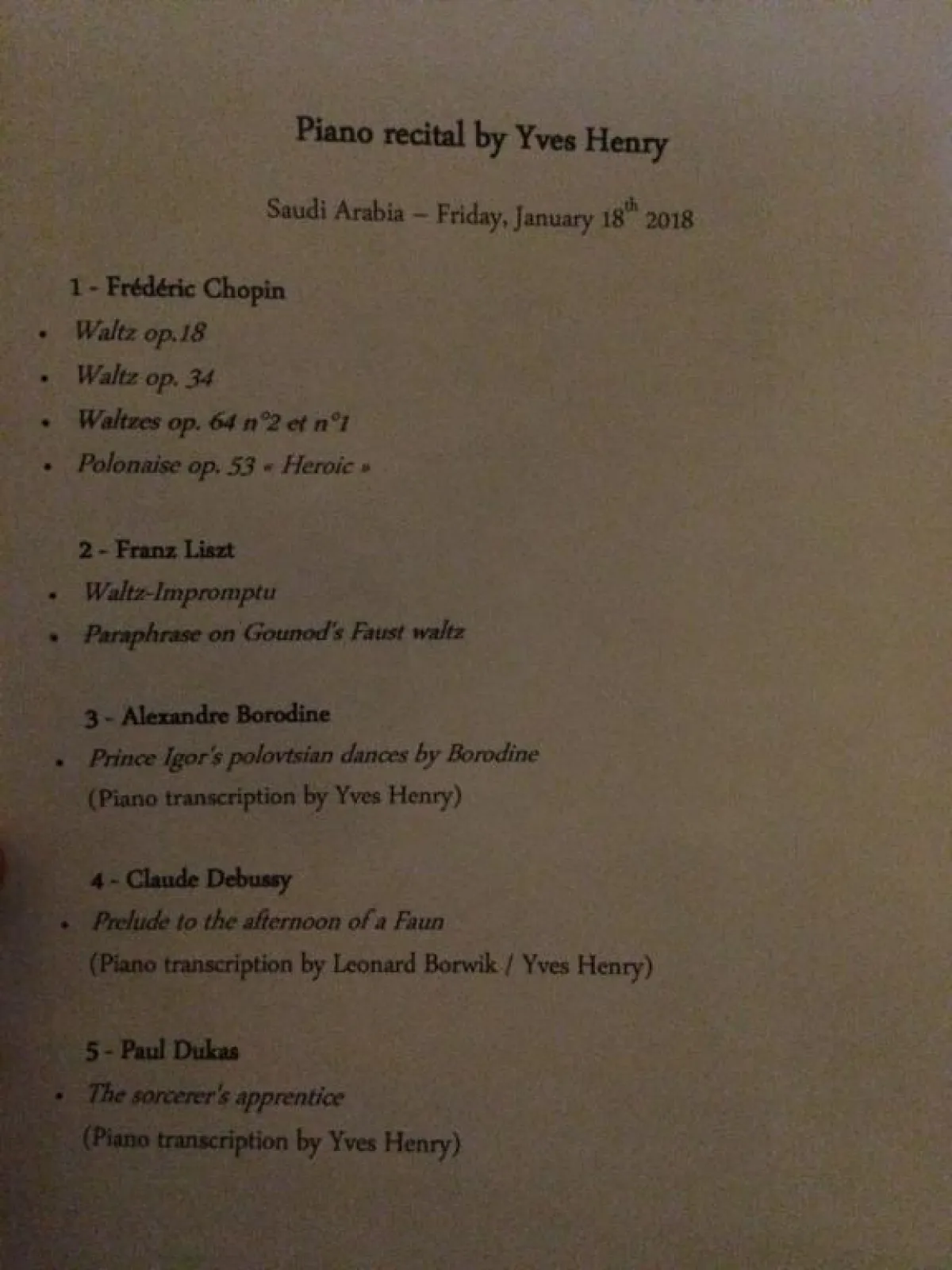 وبعد تلك الكلمات الترحيبية، تم تقديم عازف البيانو "هنري"، الذي عبر عن شكره وامتنانه للمشاركة في هذا الحفل، ثم بدأ الحفل من خلال نغمات النشيد الوطني السعودي، الذي أبدع عازف البيانو "إيف هنري" في أن يخرج لنا أعذب الألحان، التي حفزت الجمهور على ترديد كلمات النشيد الوطني، ليعم صوت الجمهور أرجاء القاعة، ثم استمعنا للعديد من المقطوعات الموسيقية الكلاسيكية والرومانسية، التي أدهشت وأعجب بها كافة الحضور في أجواء موسيقية ساحرة، وقدم عازف البيانو الفرنسي "إيف هنري" العديد من المقطوعات الموسيقية الشهيرة لمختلف عازفي البيانو، ومنهم: "فريدريك شوبان"، والذي قدم له موسيقى رقصة "الفالس" Waltz op. 18 " من خلال أنغام البيانو، والذي أبدع في عزفها "إيف هنري"، كما قدم إحدى المقطوعات الموسيقية للموسيقار "فرانس لست"، بالإضافة لتقديم موسيقى رومانسية للمؤلف الموسيقي الموسيقار "الكسندر بورودين"، وغيرهم كثر من المبدعين في عالم الموسيقى، والذين نسخ "هنري" موسيقاهم من خلال البيانو بأنامله، التي كانت تنقر على أصابع البيانو، فتلمس القلب والروح، والذي كان يعزف بكل مشاعره ووجدانه، لتنقل مشاعر الفنان لنا من خلال إبداع الألحان التي يسمو بها العقل والروح.