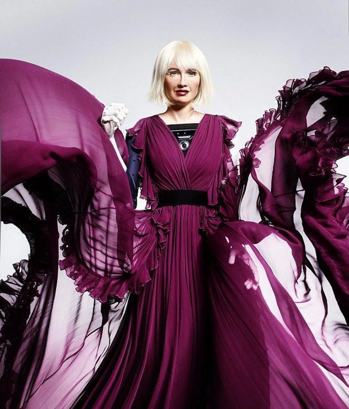 وبدت صوفيا بكامل أناقتها حيث ظهرت وهي تضع الماكياج وترتدي الشعر المستعار، في جلسة تصوير تم تنفيذها بالكامل من قبل الآلات، حيث قامت طائرات من دون طيار بوضع الماكياج والتصوير.