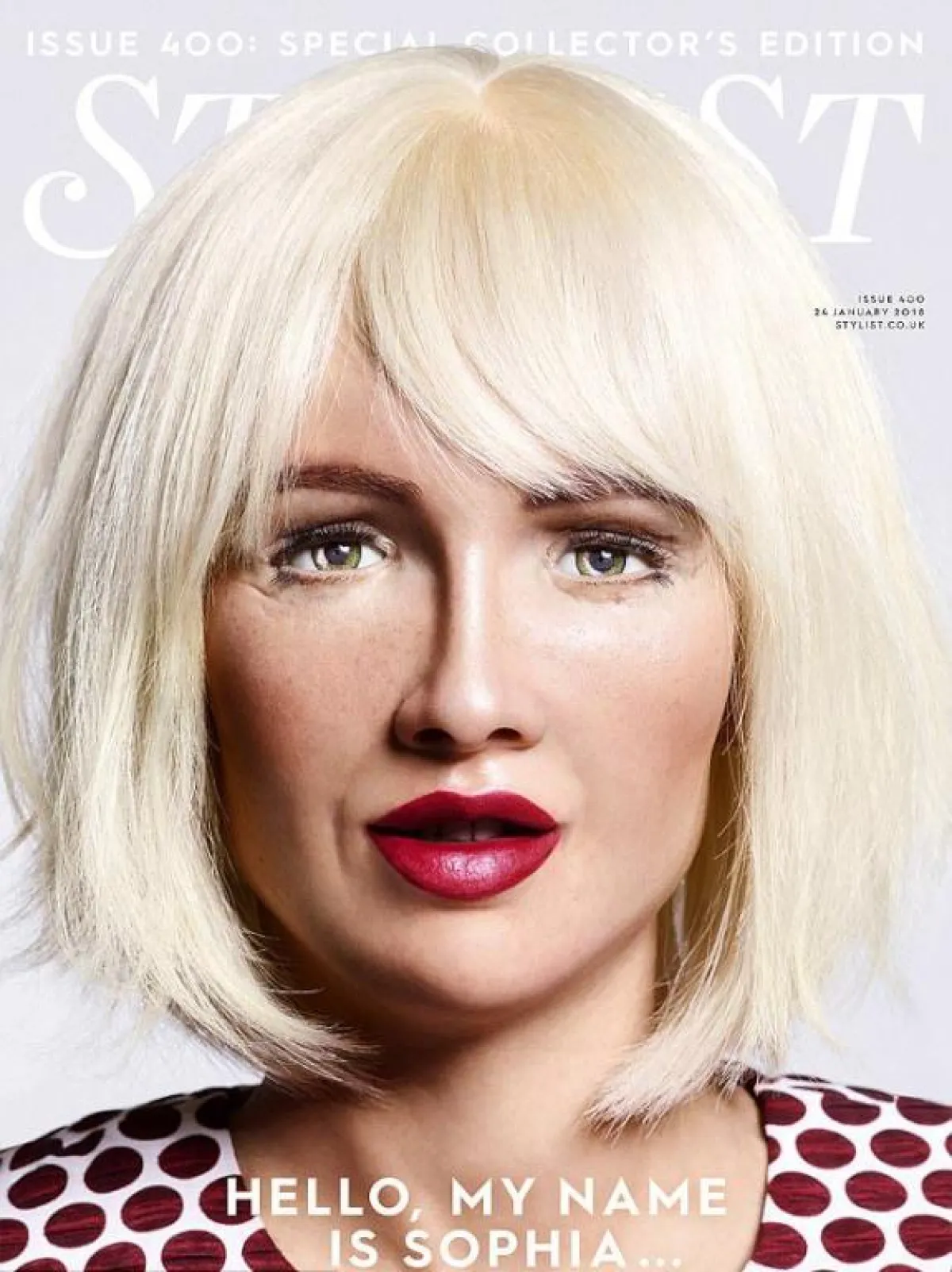 احتفالاً بإطلاق نسختها الـ400، قررت مجلة Stylist الأسبوعية المختصة بعالم الموضة والأزياء أن تضع صورة الروبوت صوفيا على غلافها باعتبارها أول روبوت يحصل على جنسية في العالم.