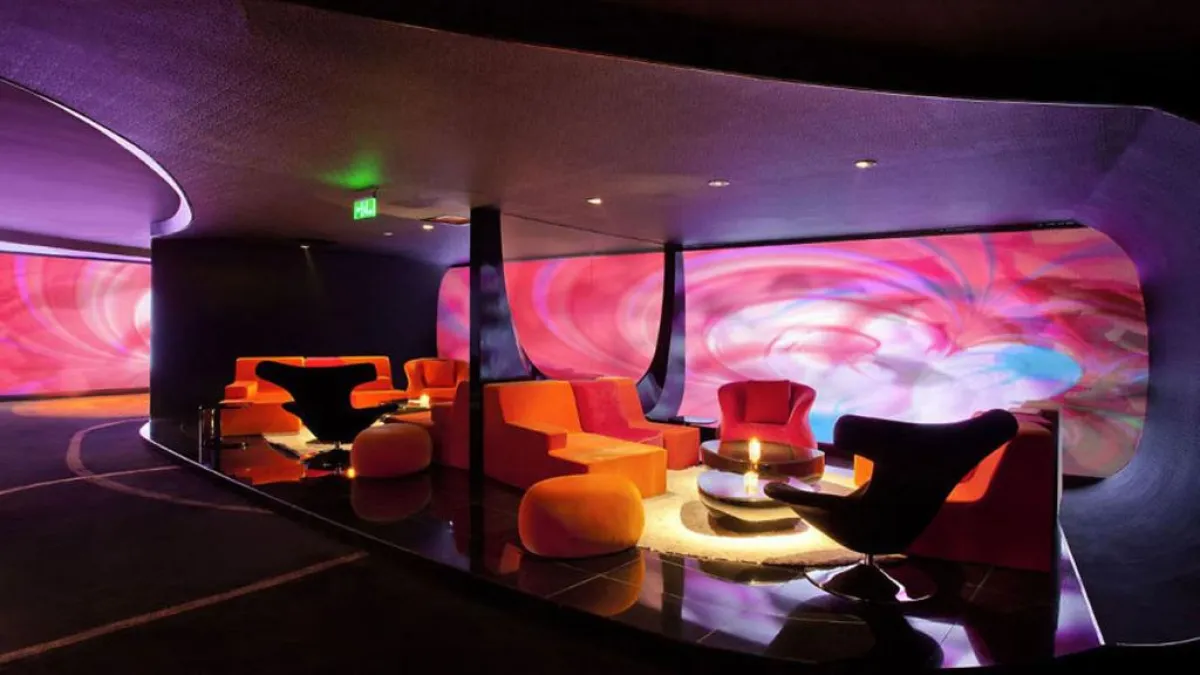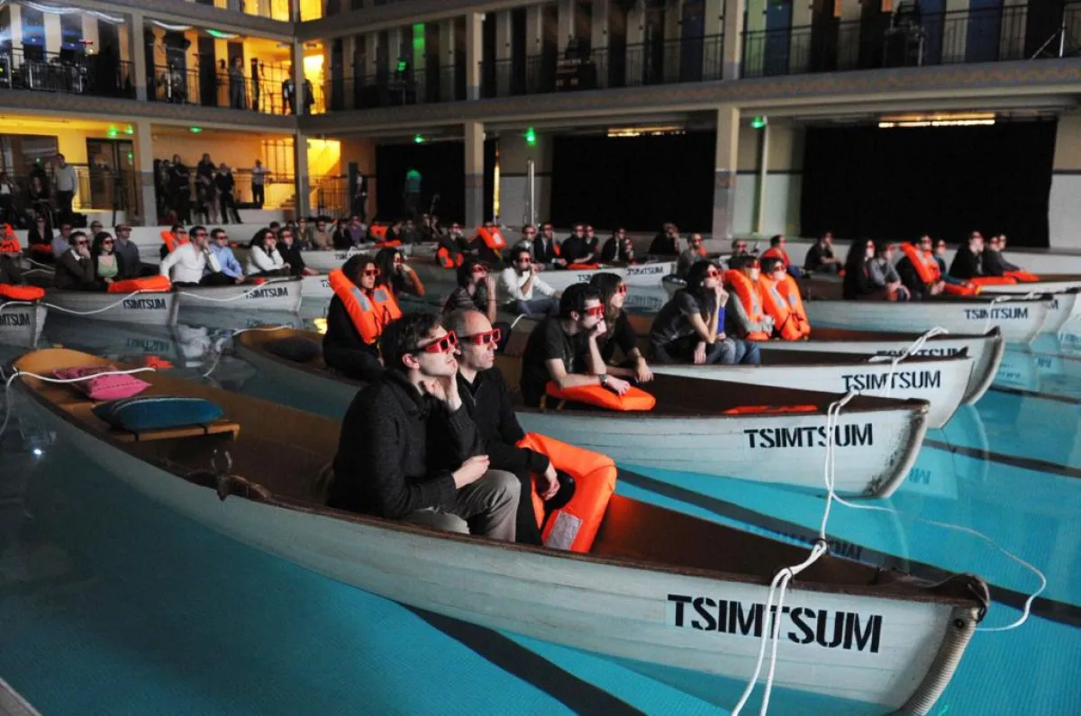 عبارة عن قاعة سينما في حمام السباحة ومقاعدها على شكل زوارق بحرية تتسع لثلاث أشخاص.