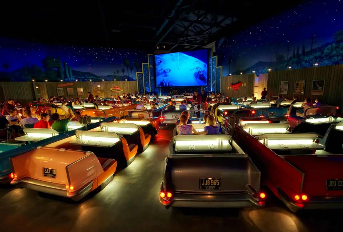قاعة في الهواء الطلق بـ استديوهات ديزني هوليوود، تأخذك إلى أجواء الأفلام القديمة بالسيارات موديل الخمسينيات ويتقدمها شاشة العرض.