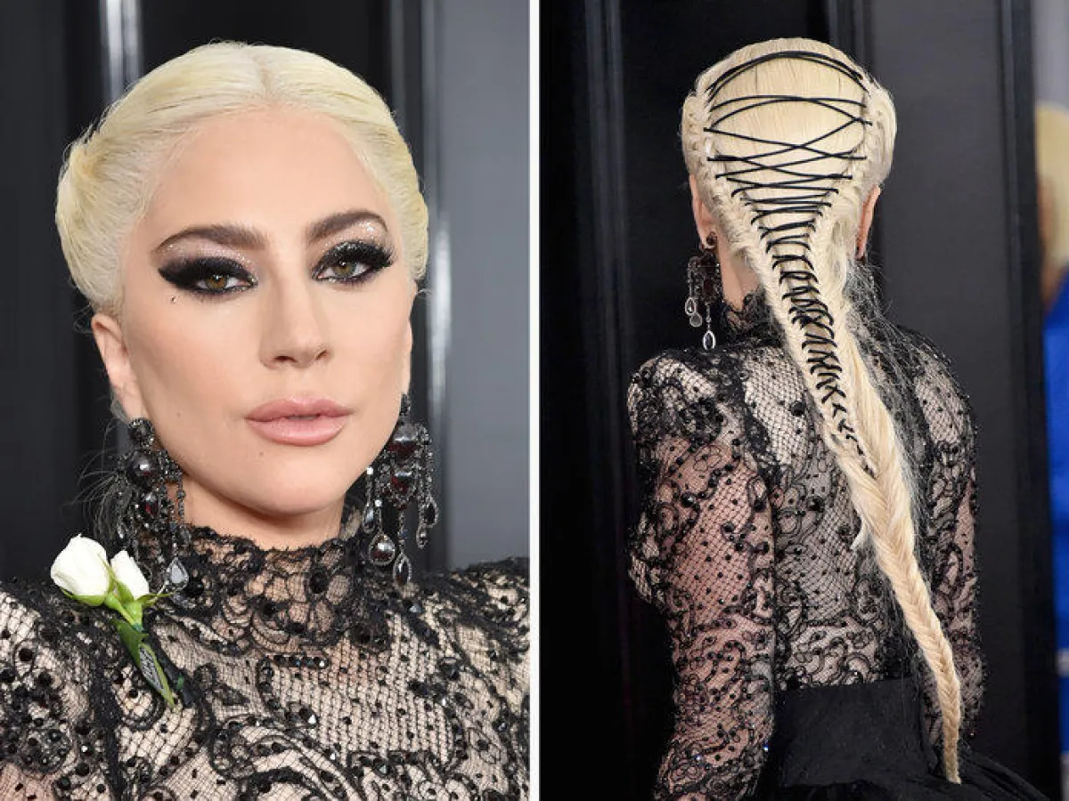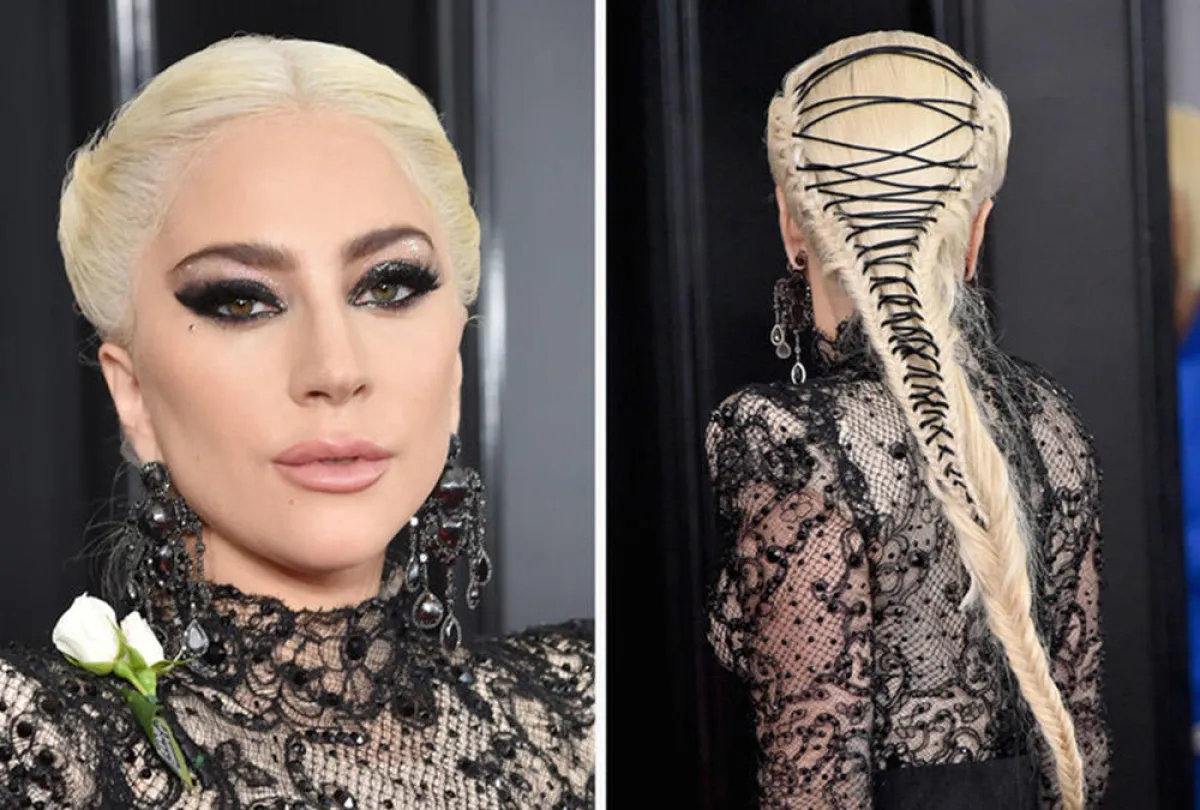Lady Gaga: هذه النجمة التي عودتنا على الاطلالات المبالغ بها والغريبة إلى حد الجنون، فاجأتنا باطلالة لافتة وجاذبة وراقية. إنه مكياج العيون السموكي مع الأيلاينر المجنّح الذي سحب عينيها. كما استخدمت الظلال الغليتر الفضي عند الجفن العلوي الثابت. إضافة إلى تسريحة شعرها المميزة، حيث اعتمدت الفرق النصفي مع ضفيرتين من أعلى الرأس، لتجتمع بضفيرة واحدة عند الخلف متصلتين بشريط أسود كاكسسوار جديد للشعر.