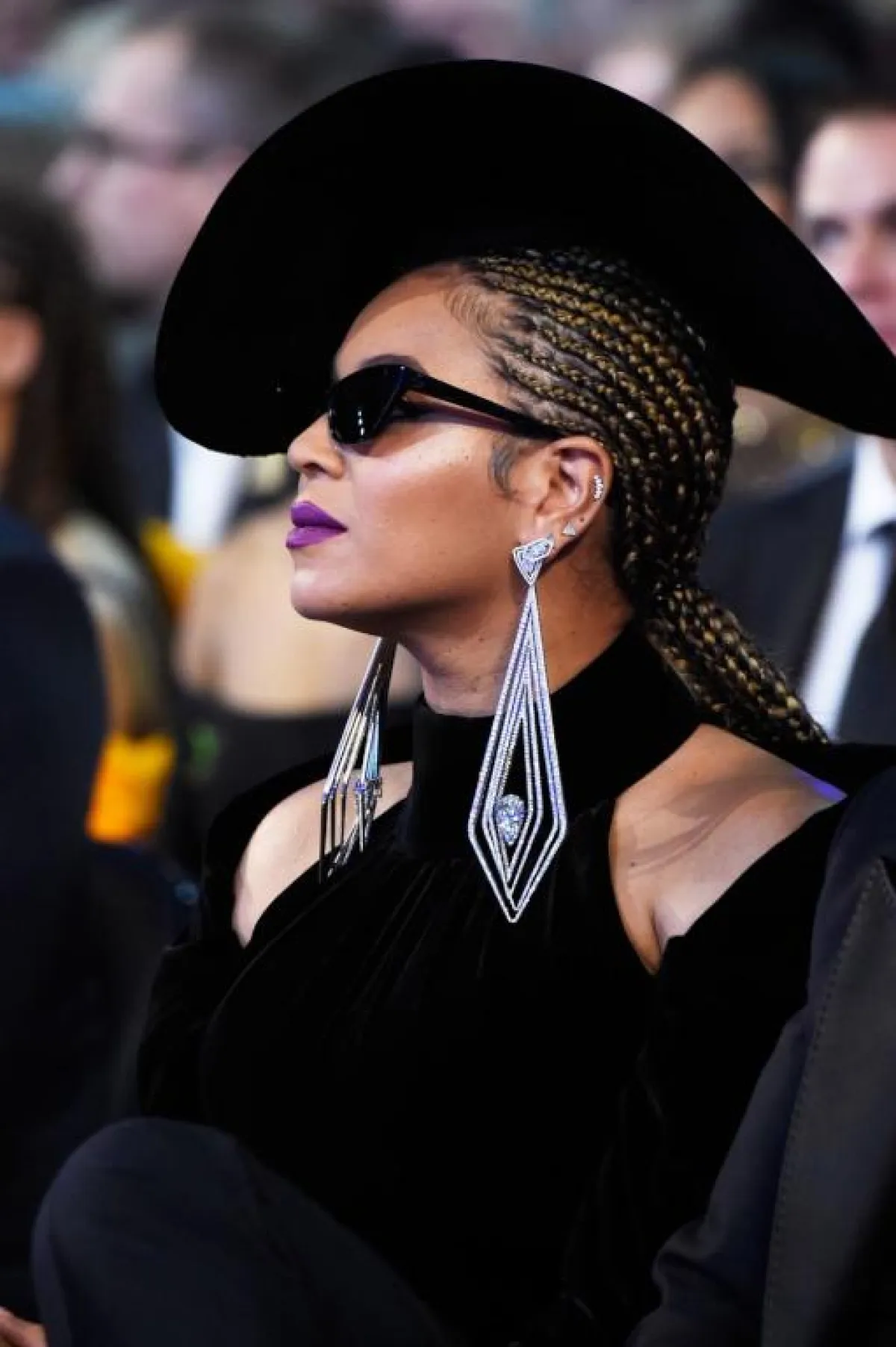 Beyonce: كنا ننتظرها باطلالة مخالفة، إلا أنها بدت جميلة مع الضفائر الأفريقية، والقبعة السوداء، إضافة إلى أحمر الشفاه البنفسجي.