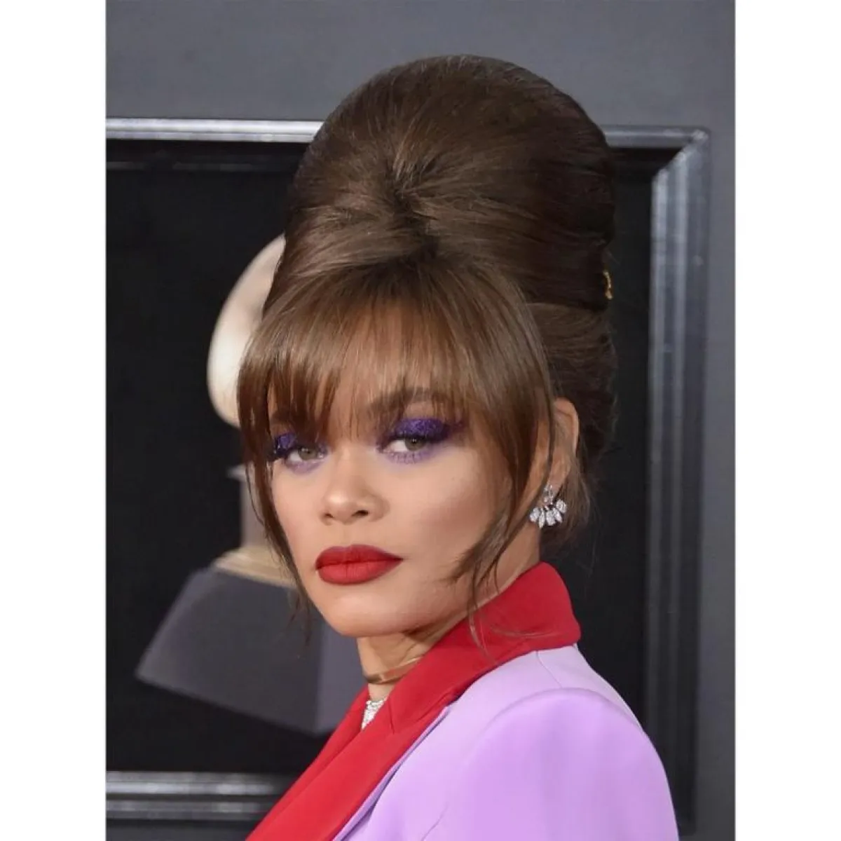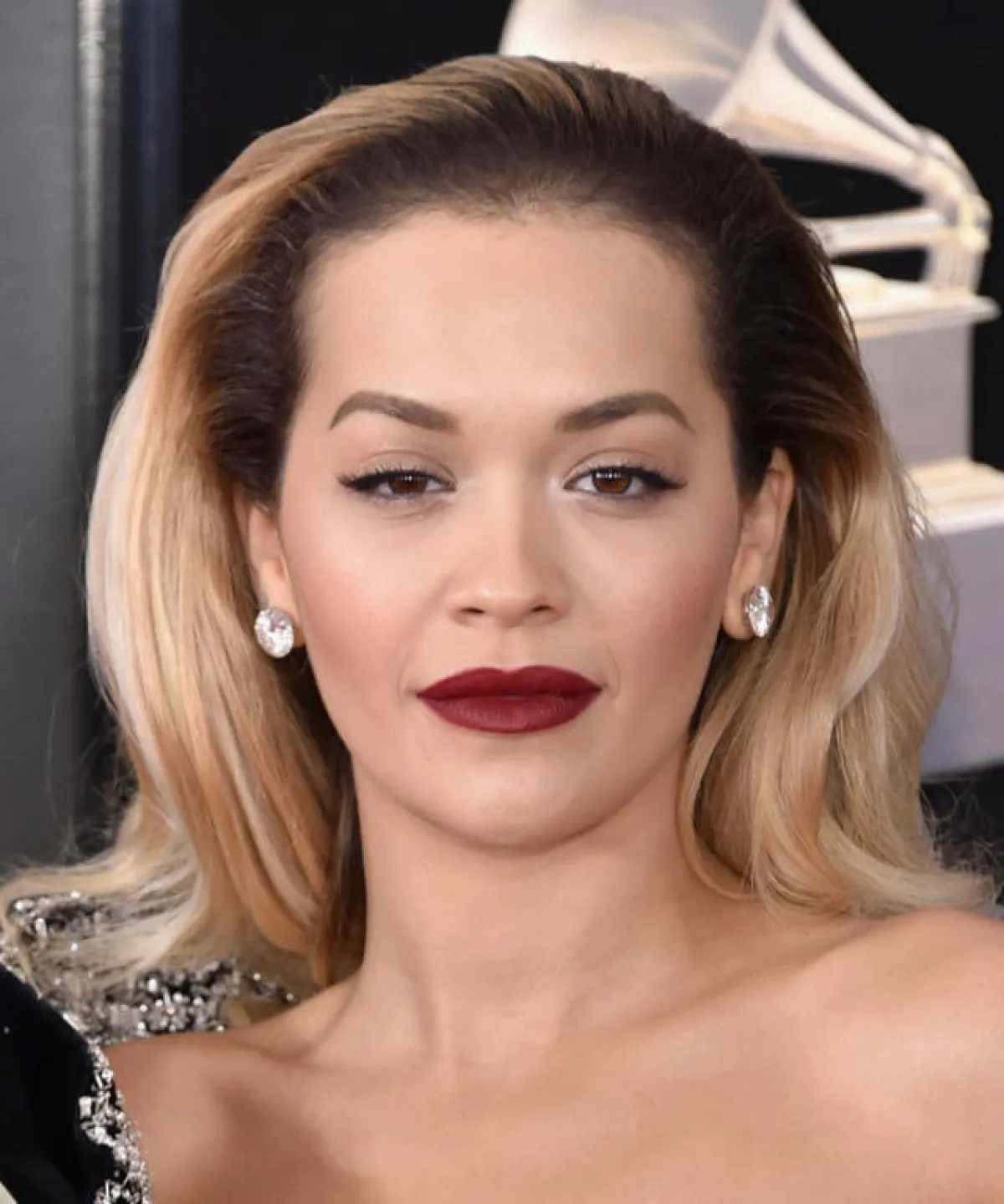 Rita Ora : حتى ريتا ابتعدت عن الجنون باطلالة كلاسيكية مع تسريحة شعرها الجاذبة إلى الخلف، لتُبرز جمال وجهها وموضة لون أحمر الشفاه البرغندي.