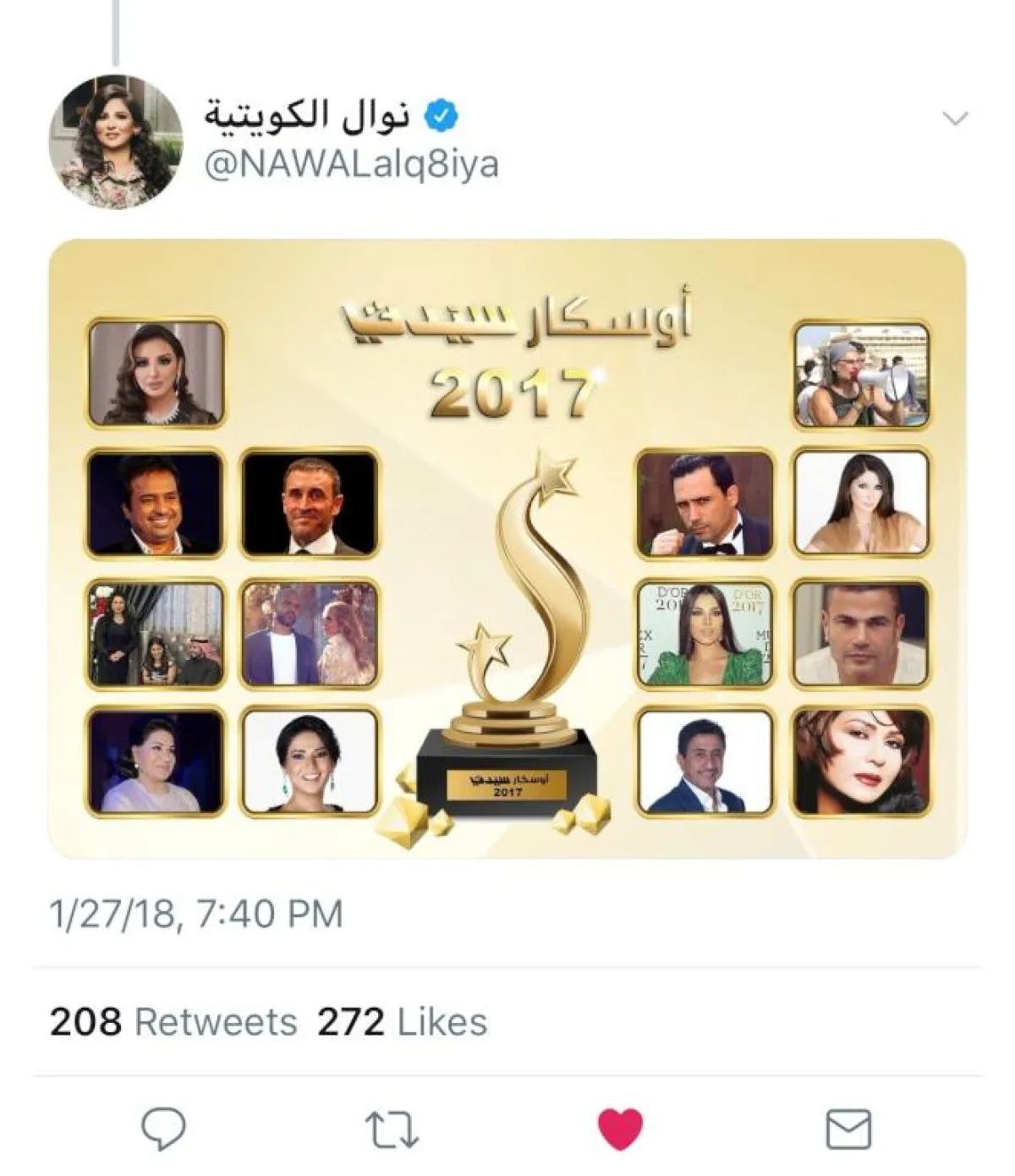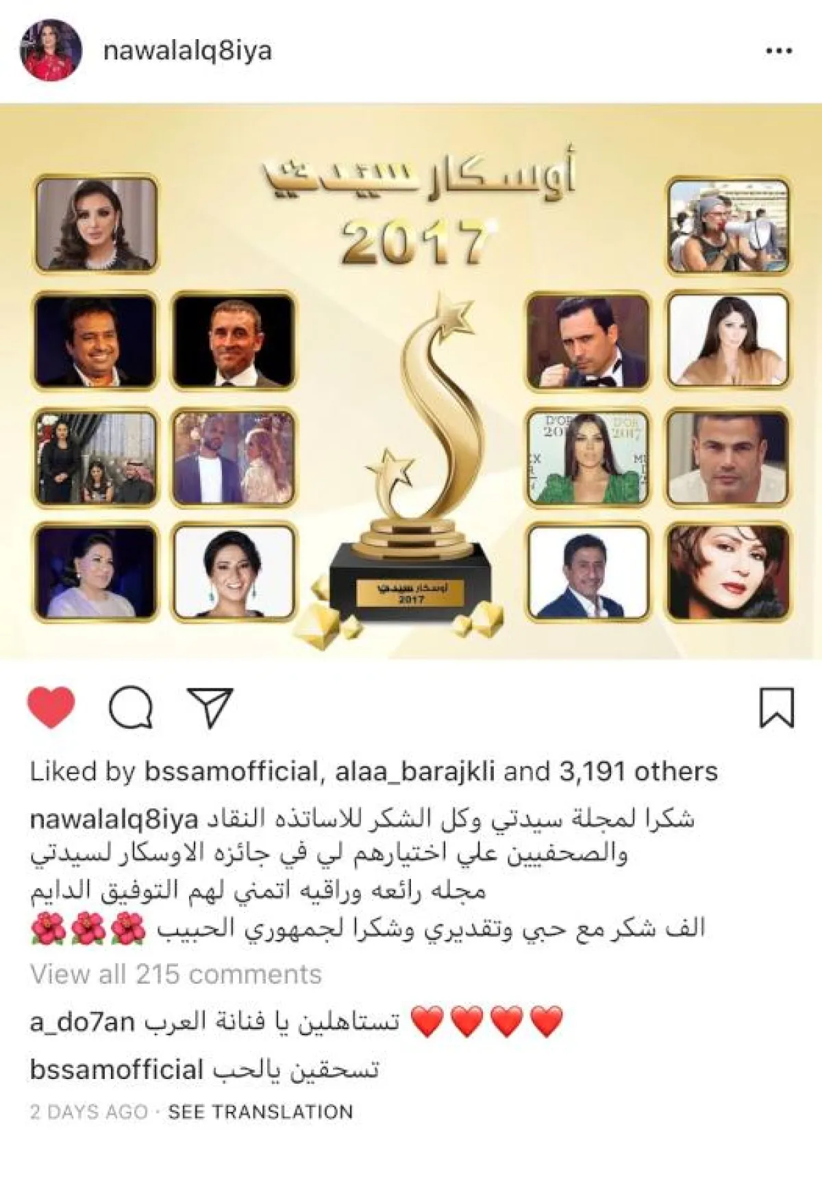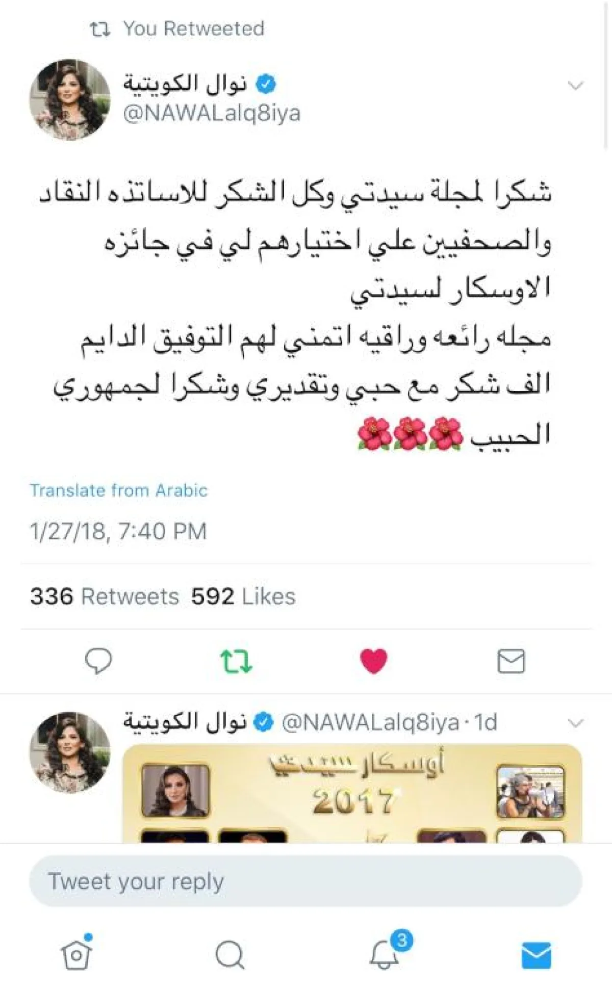 وتوجهت "قيثارة الخليج" بالشكر إلى كل من صوت لها ومؤكدة أن هذه الجائزة تحملها مسؤولية وقالت في تغريدات على موقع التواصل الاجتماعي "تويتر" " شكراً لمجلة" "سيدتي وكل الشكر للأساتذه النقاد والصحفيين على اختيارهم لي في جائزة الأوسكار لسيدتي، مجله رائعه وراقيه اتمنى لهم التوفيق الدائم، الف شكر مع حبي وتقديري وشكرا لجمهوري الحبيب".