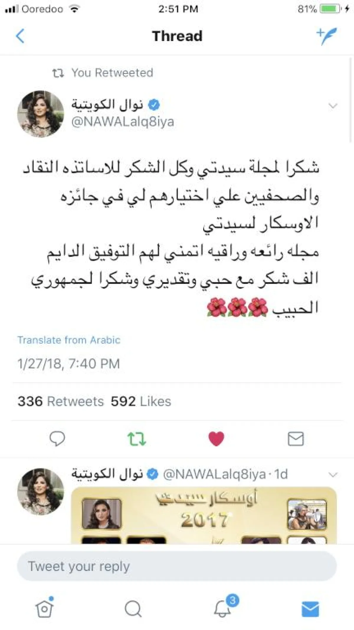 عبرت النجمة نوال الكويتية عن سعادتها بالحصول على لقب أفضل مطربة خليجية في "أوسكار سيدتي" متوجهة بالشكر إلى كل من صوّت لها ومؤكدة أن هذه الجائزة تحمّلها مسؤولية وقالت " شكراً لمجلة "سيدتي" وكل الشكر للأساتذة النقاد والصحفيين على اختيارهم لي في جائزة "أوسكار سيدتي"، مجلة رائعة وراقية أتمنى لهم التوفيق الدائم، ألف شكر مع حبي وتقديري وشكراً لجمهوري الحبيب ."