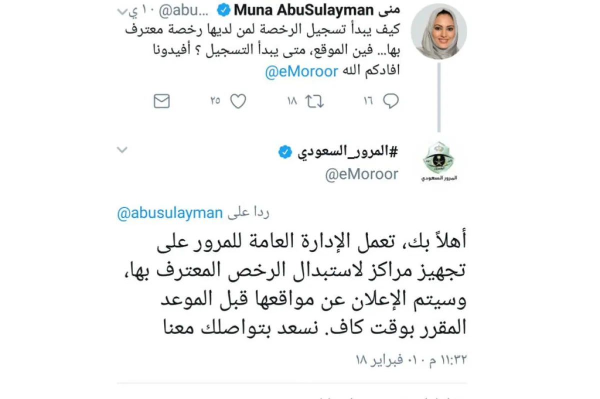 هذا وقد غردت الإعلامية منى أبو سليمان على الحساب الخاص للمرور السعودي متسائلة: "كيف يبدأ تسجيل الرخصة لمَن لديها رخصة معترف بها... وأين الموقع، ومتى يبدأ التسجيل؟ .