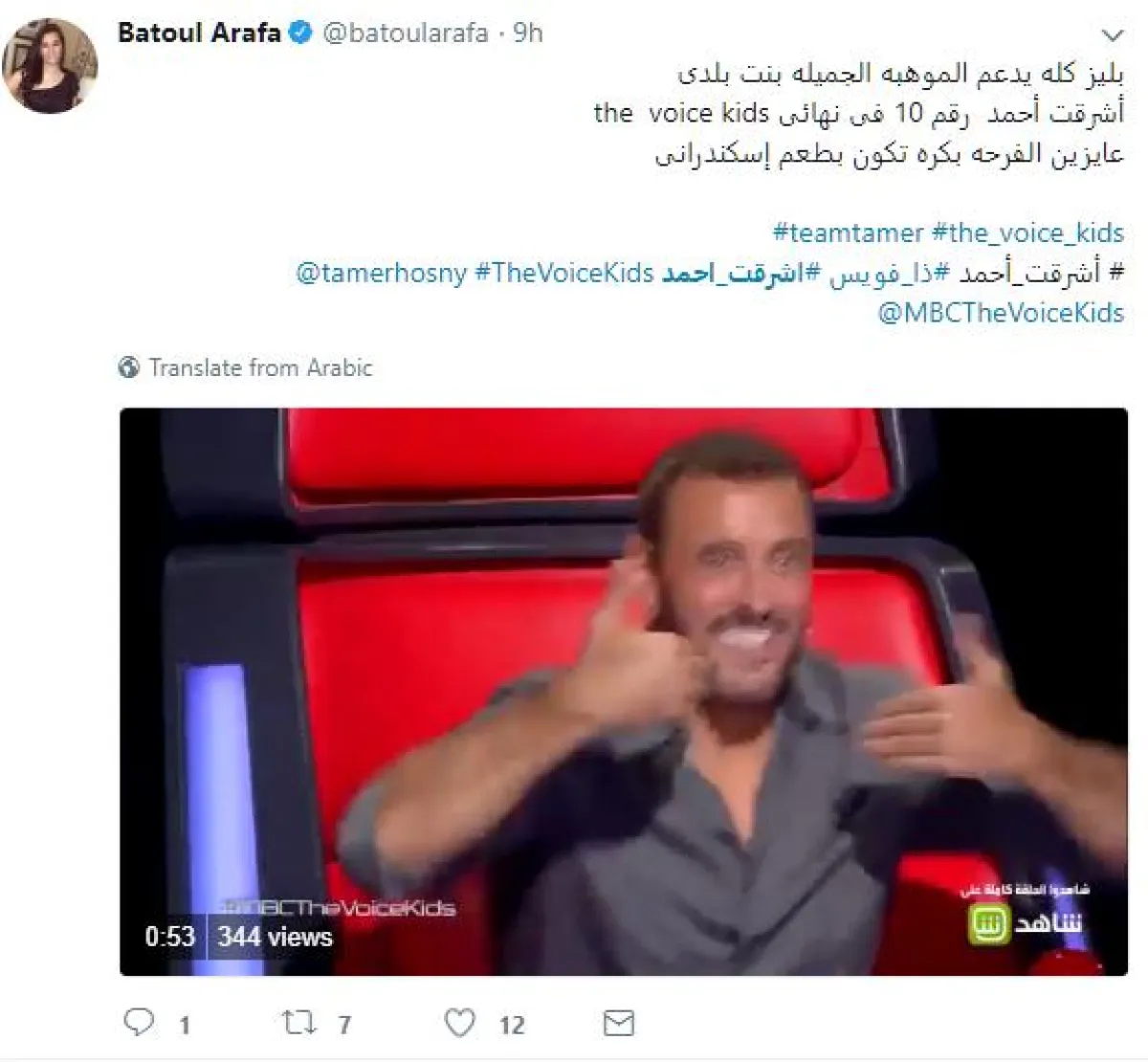 بينما غردت المخرجة بتول عرفة عبر حسابها بموقع تويتر قائلة: بليز كله يدعم الموهبه الجميله بنت بلدى أشرقت أحمد رقم 10 فى نهائي the voice kids عايزين الفرحه بكره تكون بطعم إسكندراني.