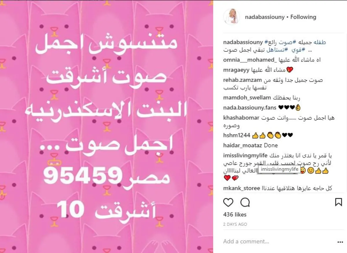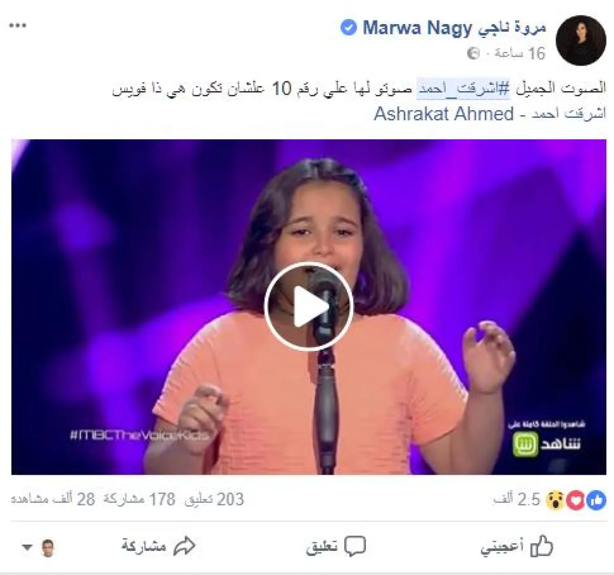 مروة ناجي كتبت عبر حسابها الرسمي بموقع الفيس بوك: الصوت الجميل #اشرقت_احمد صوتو لها على رقم 10 علشان تكون هي ذا فويس!!