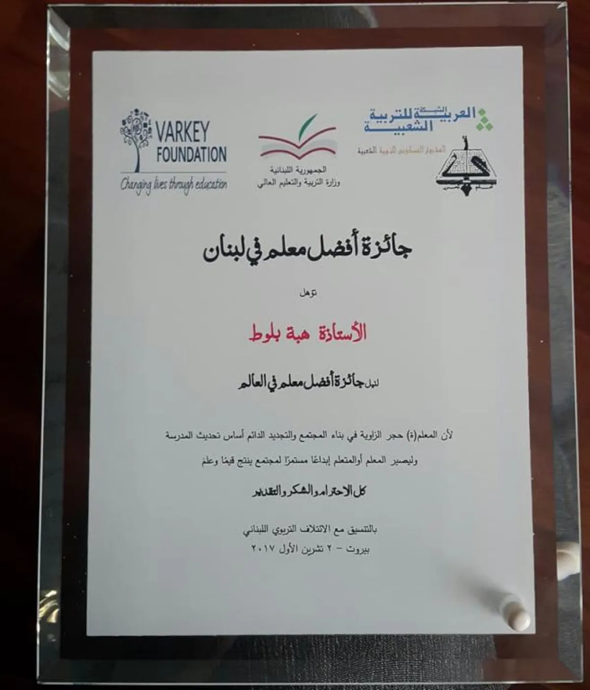 تمّ اختيار المعلّمة اللبنانية هبة بلوط (32 عاماً) ضمن القائمة النهائية لأفضل 50 معلماً مرشحين لنيل "جائزة أفضل معلم في العالم 2018" المقدمة من "مؤسسة فاركي". وتعتبر الجائزة، التي تدخل عامها الرابع، أكبر جائزة من نوعها في العالم بقيمتها البالغة مليون دولار أميركي.
