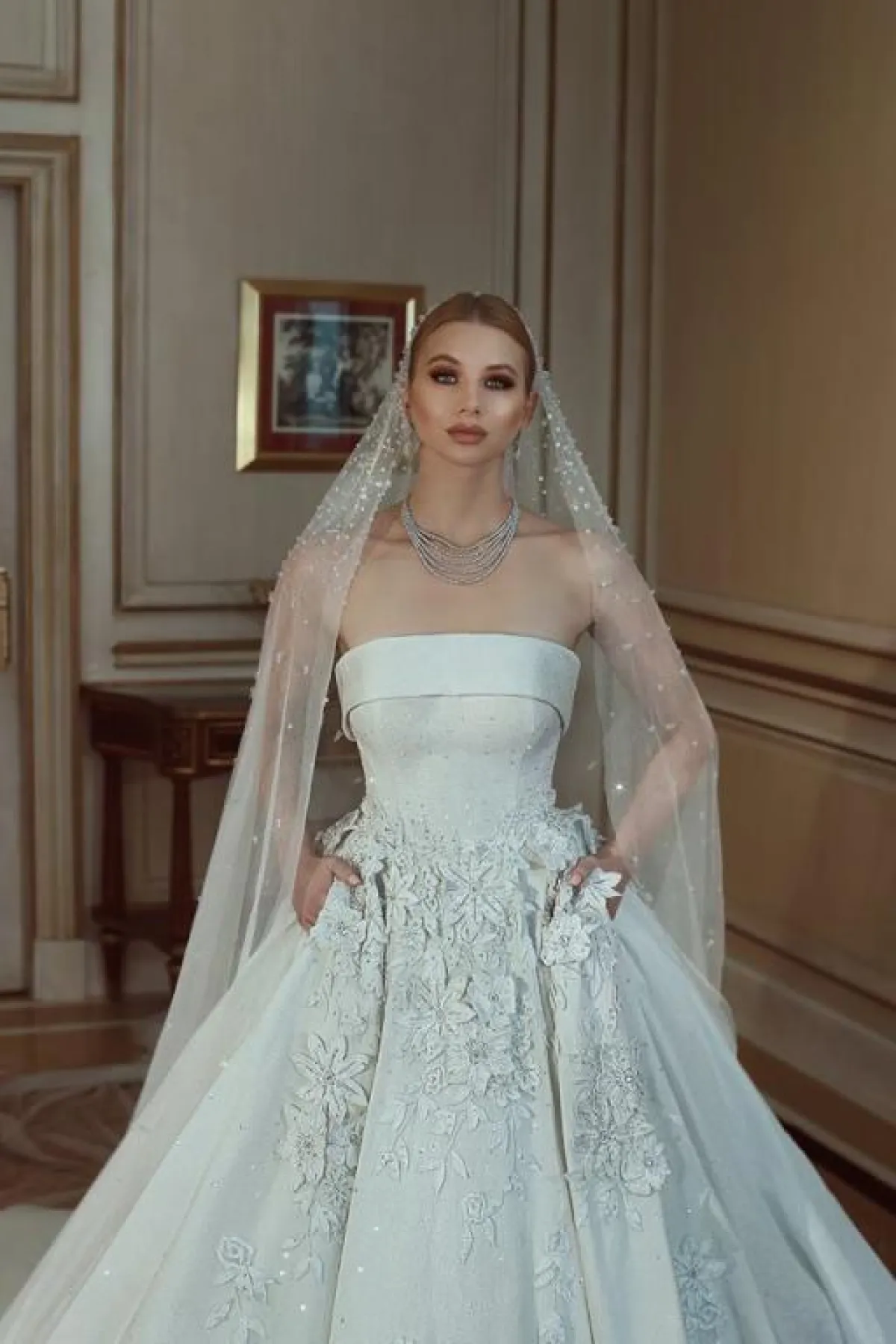 ومن بين الصيحات التي أضافها المصمم صادق ماجد إلى فساتينه، هي الجيوب التي يمكن أن تضع فيها العروس أحمر الشفاه أو الماسكرا.
