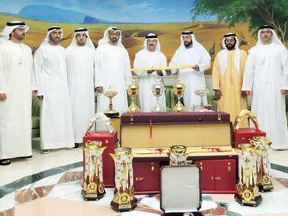 تسلم الشيخ خليفة بن زايد آل نهيان رئيس دولة الإمارات العربية المتحدة، بحضور الفريق أول الشيخ محمد بن زايد آل نهيان ولي عهد أبوظبي نائب القائد الأعلى للقوات المسلحة، سيفي رئيس الدولة الذهبيين اللذين حازتهما هجن الرئاسة عن طريق «بو الأبيض» و«الذيبة» في المهرجان الختامي لسباقات الهجن بالوثبة خلال الفترة من 10 إلى 19 مارس الجاري. وسلم رئيس الدولة السيفين الشيخ منصور بن زايد آل نهيان نائب رئيس مجلس الوزراء وزير شؤون الرئاسة. وهنأ رئيس الدولة الفائزين بسيفي المهرجان الختامي في الوثبة.