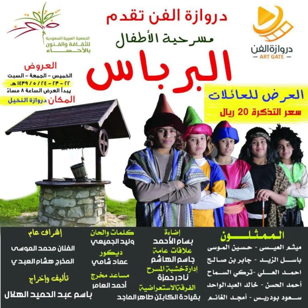 بالتعاون مع الجمعية العربية السعودية للثقافة والفنون بالأحساء تقدّم مؤسسة "دروازة الفن" للإنتاج الفني مسرحية الأطفال "البرباس" على مسرح منتجع "دروازة النخيل" بالأحساء لمدة ثلاثة أيام بدءًا من يوم بعد غد الخميس حتى يوم السبت، ويبدأ العرض تمام الساعة 8 مساءً. المسرحية من تأليف وإخراج باسم الهلال، وكتب كلمات أغاني الأطفال وقام بتلحينها الفنان وليد الجميعي ويشارك في التمثيل مجموعة من الأطفال الموهوبين، وهم الممثلون :ميثم ثامر العيسى وحسين الموسى وباسل الزيد وجابر بن صالح وأحمد العلي وتركي السماح وأحمد الحسن وخالد العبد الواحد وسعود بو دريس وأمجد الغانم.
