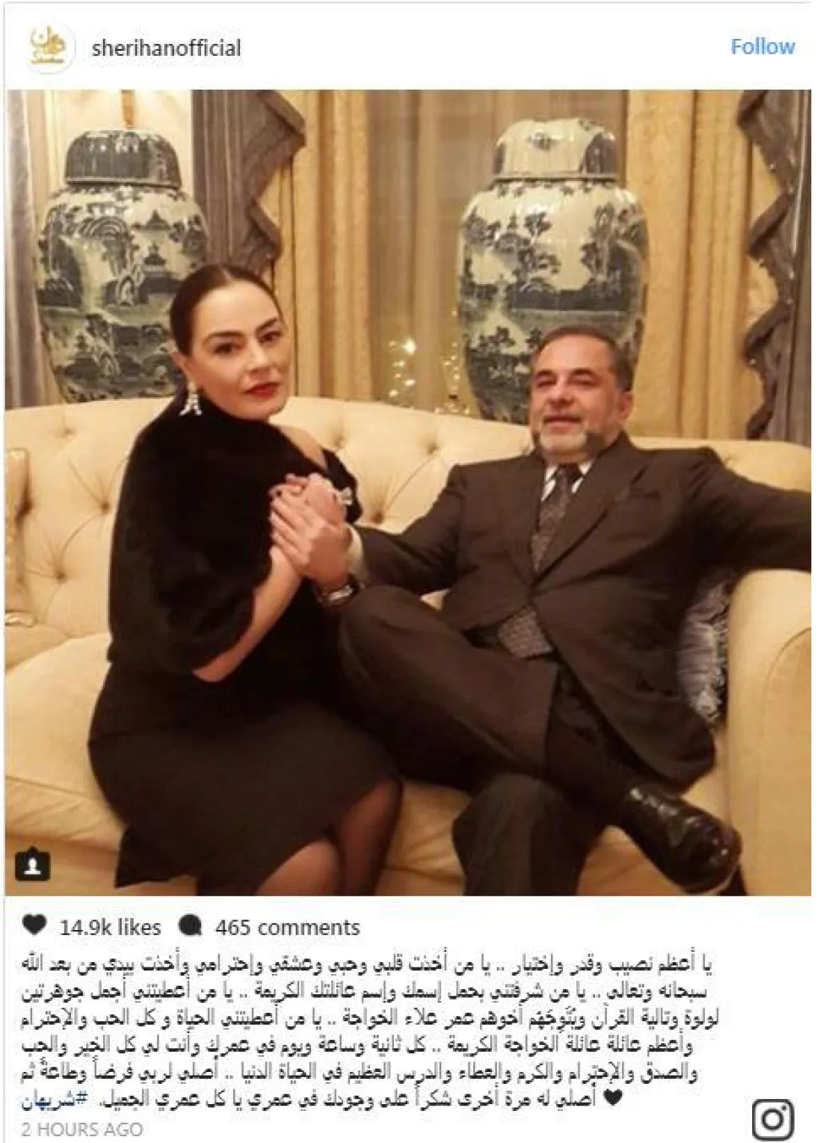 الفنانة شريهان نشرت العشرات من رسائل المودة والمحبة لابنتيها وبعض رفاق مسيرة الفن، ولكن الرسالة الأكثر شهرة الآن، كانت الأولى من نوعها إلى زوجها الثري الأردني علاء الخواجة، تعليقاً على صورة هي الأولى أيضاً في ألبوم شريهان، وقالت في رسالتها عبر «انستقرام»: يا أعظم نصيب وقدر واختيار.. يا من أخذت قلبي وحبي وعشقي واحترامي وأخذت بيدي من بعد الله سبحانه وتعالى.. يا من شرفتني بحمل اسمك واسم عائلتك الكريمة.. يا من أعطيتني أجمل جوهرتين لولوة وتالية القرآن ويتوجهما أخوهما عمر علاء الخواجة.. يا من أعطيتني الحياة وكل الحب والاحترام وأعظم عائلة عائلة الخواجة الكريمة». وتابعت: «كل ثانية وساعة ويوم في عمرك وأنت لي كل الخير والحب والصدق والاحترام والكرم والعطاء والدرس العظيم في الحياة الدنيا.. أصلي لربي فرضًا وطاعةً ثم أُصلي له مرة أخرى شكرًا على وجودك في عمري يا كل عمري الجميل».